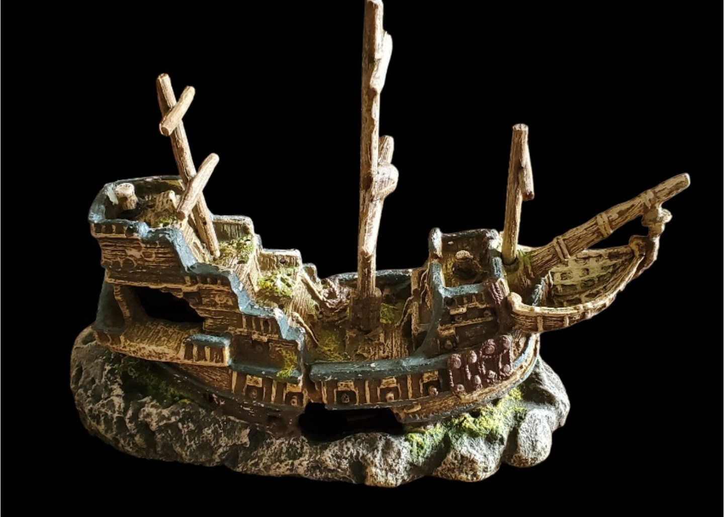 Selling a cool shipwreck ornament for your aquarium! It's a neat piece to add some character to your fish tank, giving your aquatic friends something to explore and hide in. A bit used, not perfectly fit for our new aquarium:-(. 11.5x9.5