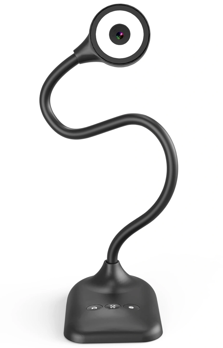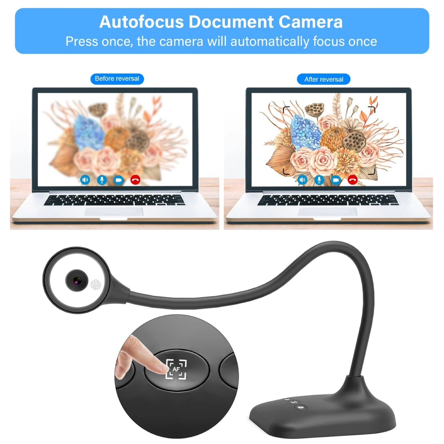 Shooting modes Movie, Automatic Exposure control type Automatic Colour Black Video capture resolution 1080p Media type USB Zoom type Adjustable 3-in-1 USB document camera, Webcam and Visualiser: Equipped with HD sensor, maximum resolution up to 2592×1944P. Hose structure design, can be adjusted at any angle. It can be used for video chat and web teaching, or flip the camera for live presentations Document camera for teachers with LED light and ISO: You can press the “☼” button for 5-level fill light, and you can easily see objects in dim environments. Touch LED light button, 3 levels of brightness adjustable, that allows the brightness to be changed according to the environment USB Webcam with image invert: the image inversion can be adjusted through the button, and it supports the mirroring function of freely adjusting the image during video chat or distance teaching. Press the focus "AF" button once to automatically focus once, from a blurry picture to a clear picture Document camera with wide range of use: for education, home and office (video conferencing, homeschooling, online tutoring, working from home, remote monitoring, making instructional videos, animating, gaming and giving live demos) Plug and Play & High Compatibility: the doc camera is equipped with a USB-C cable, which can be directly used with devices with USB-C interface such as MacBook. Compatible with Windows PCS, Macs and Chromebooks, works with Tiktok, Google Meet, Skype.