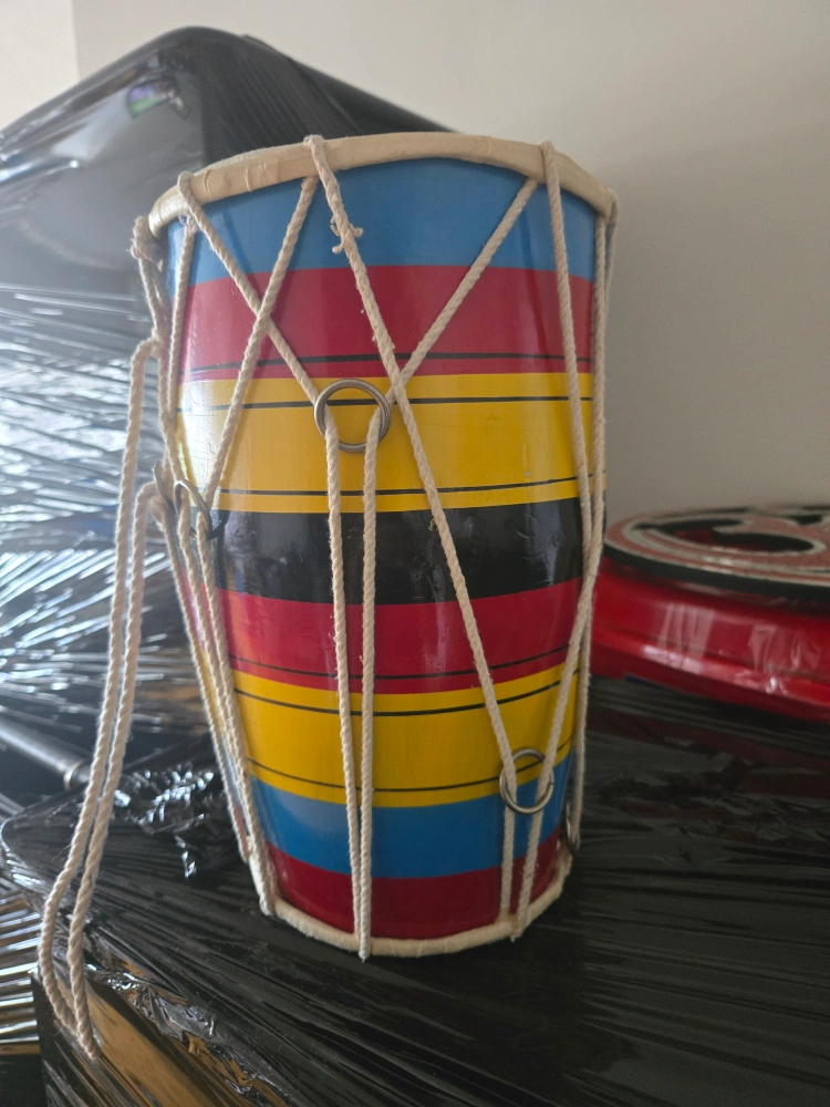 Here's a colourful dholak drum! It has a vibrant design with blue, red, yellow, and black stripes. Perfect for anyone interested in learning to play or adding a unique piece to their collection faster pick up in north york Victoria and rowena dr moving out sale.