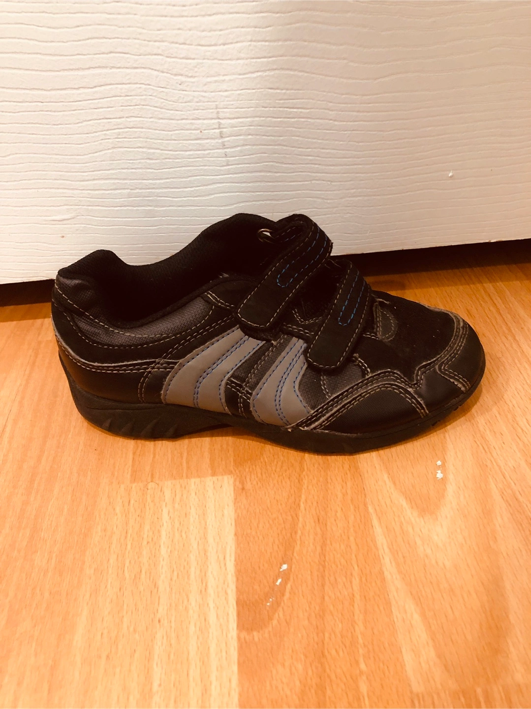 Here's a black and grey kids' shoe with velcro straps. It's in used condition, but still has lots of life left!