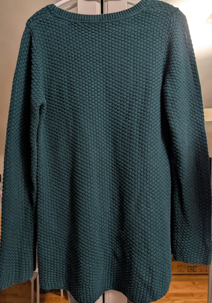 Cozy Dex sweater in a lovely green colour! It's a size small and made of 55% cotton and 45% acrylic. Perfect for layering or wearing on its own! Pick up by Keele and Rogers Cash only