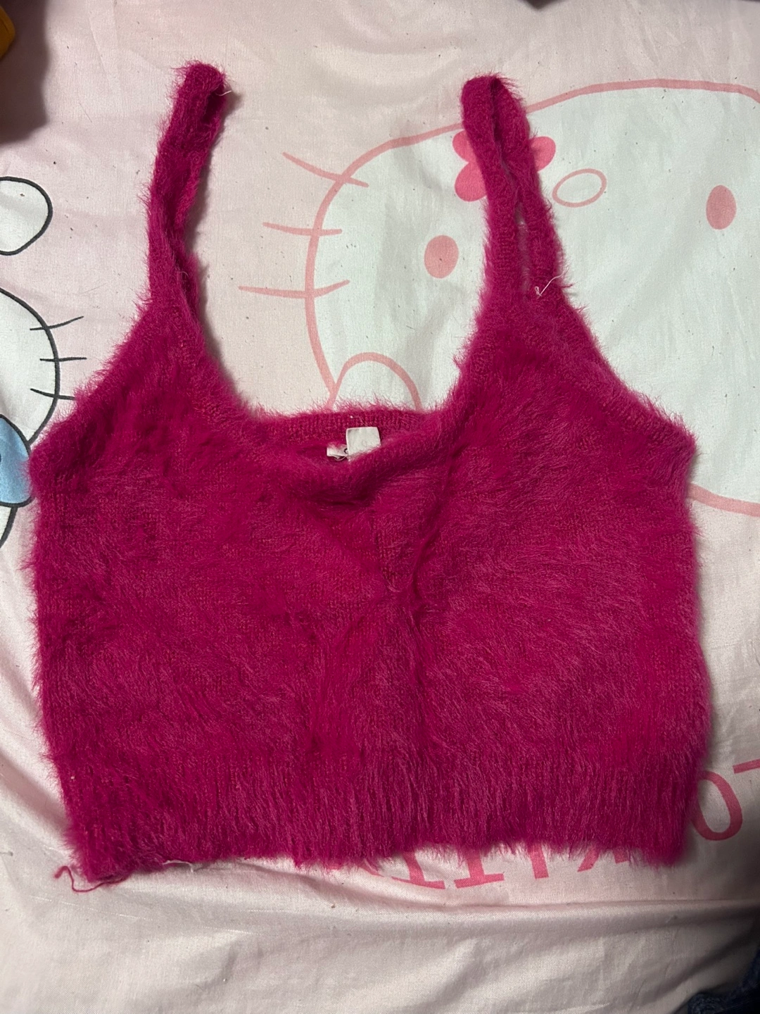 Selling a cute fuzzy cropped tank top! It's a cute pink colour and would be perfect for layering or wearing on its own. It's in good condition.