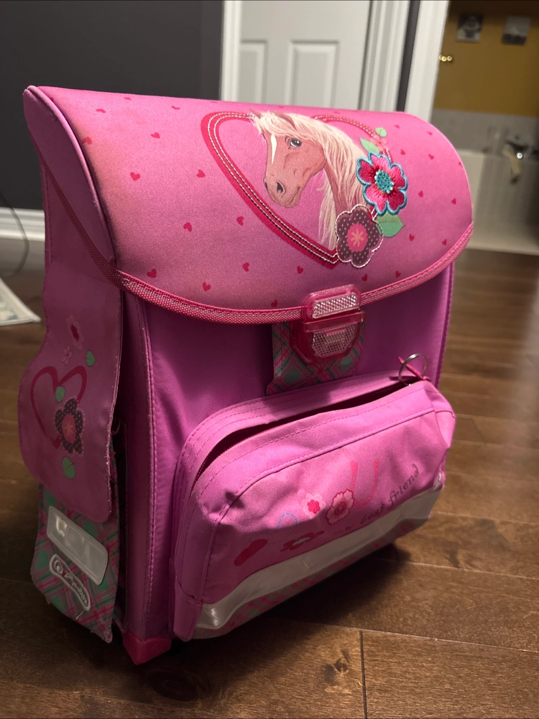 Selling a cute pink school backpack featuring a horse design! It has a sturdy build and includes multiple compartments for organizing books and supplies. Perfect for elementary school students!