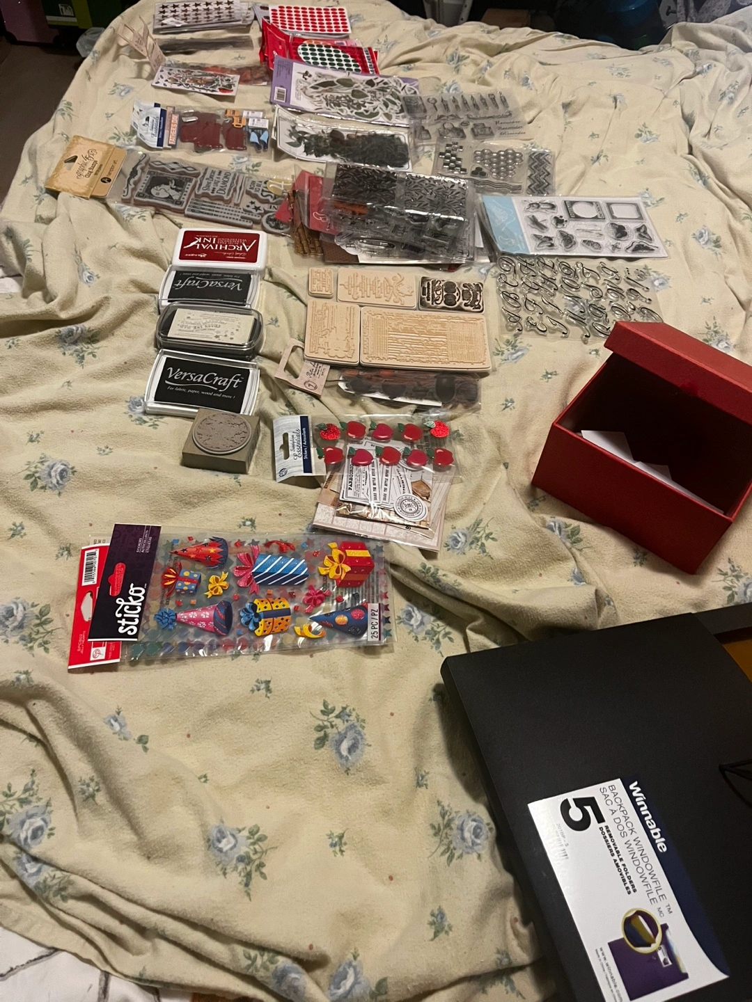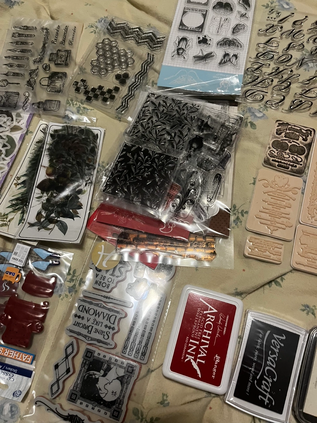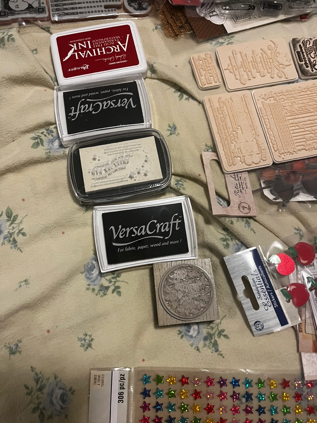 Selling a variety of craft supplies including stamps, stickers, and ink pads. Perfect for scrapbooking, card making, and other creative projects!