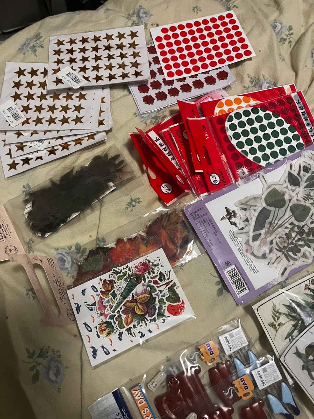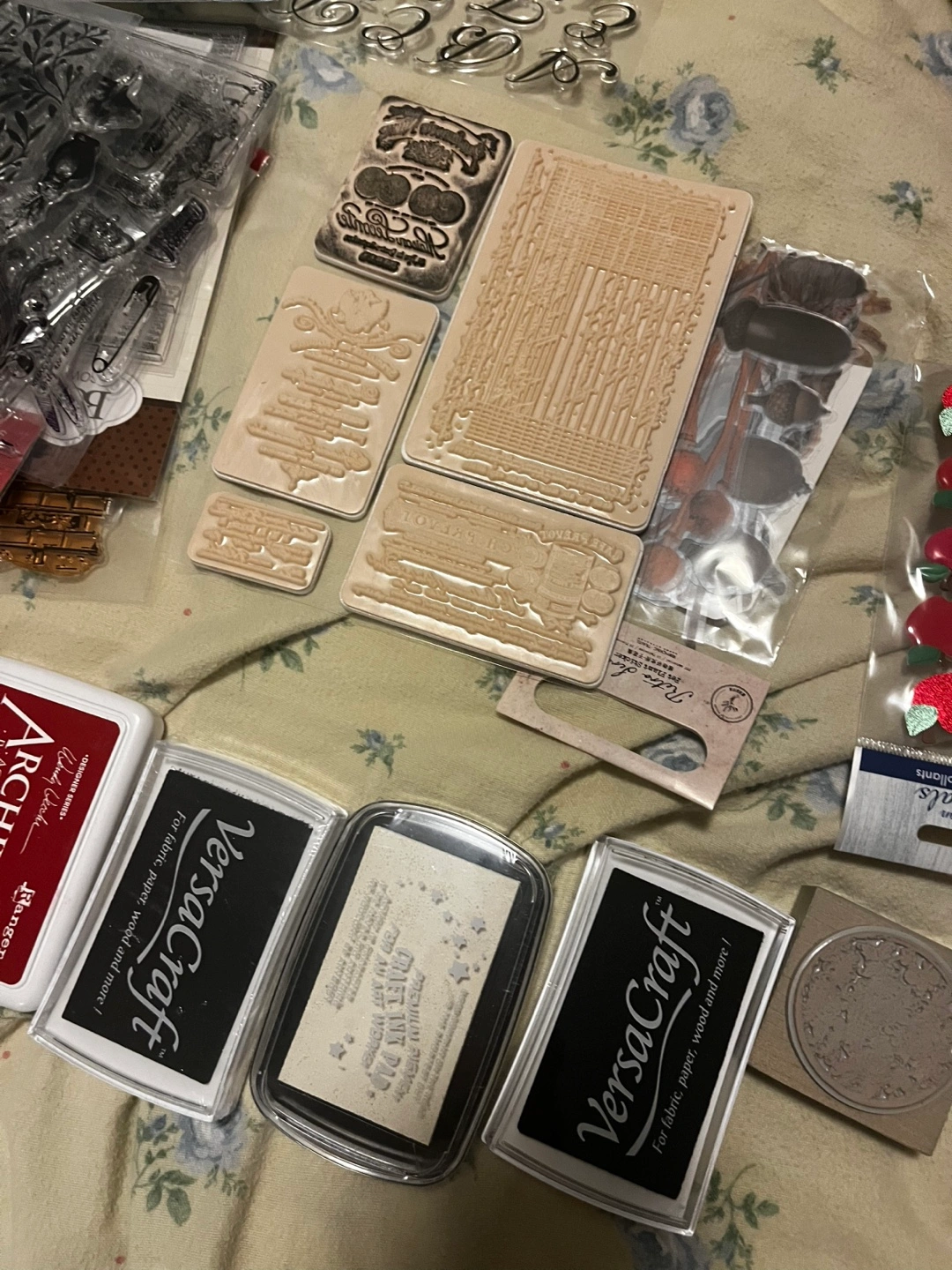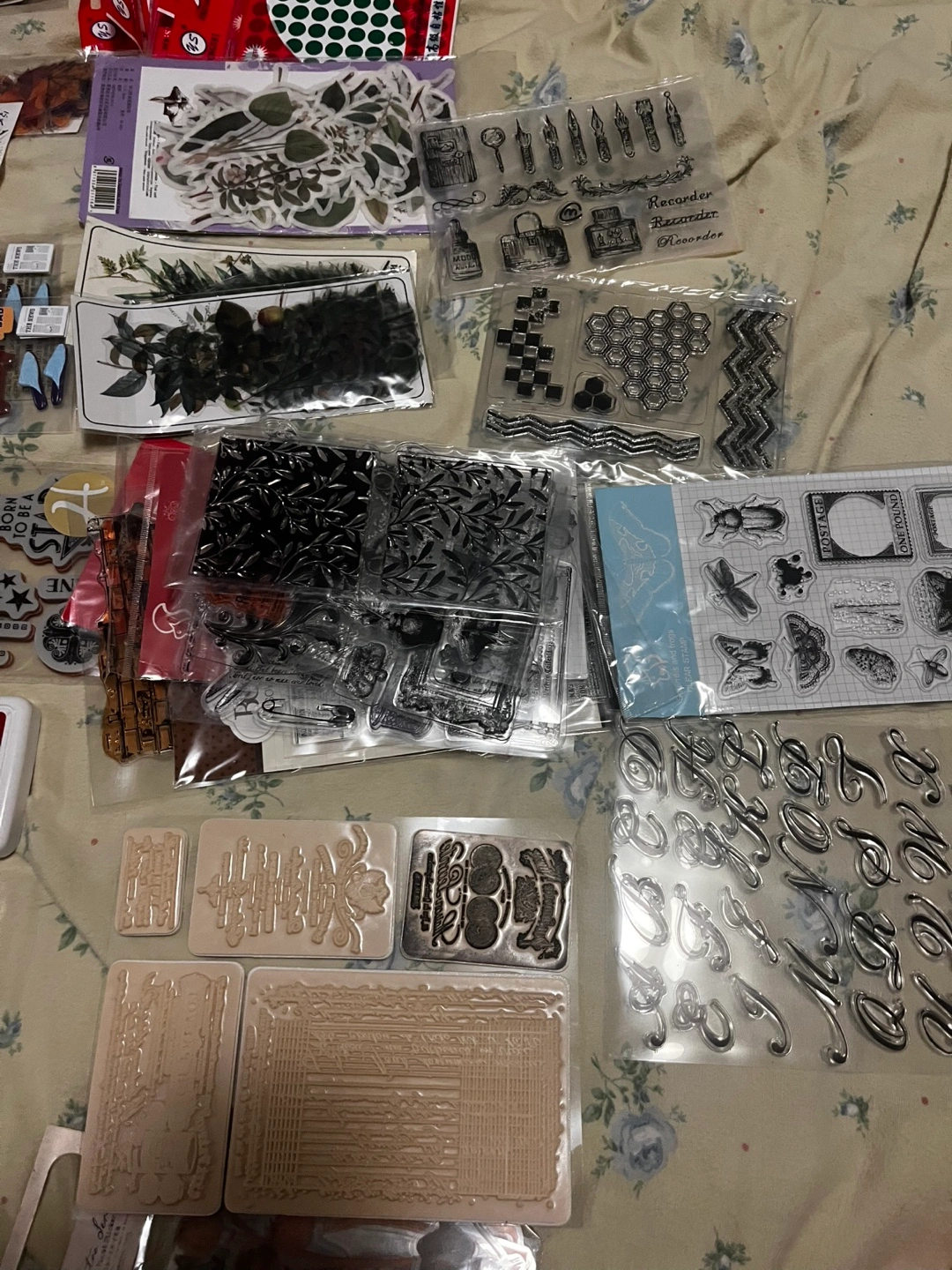 Selling a variety of craft supplies including stamps, stickers, and ink pads. Perfect for scrapbooking, card making, and other creative projects!