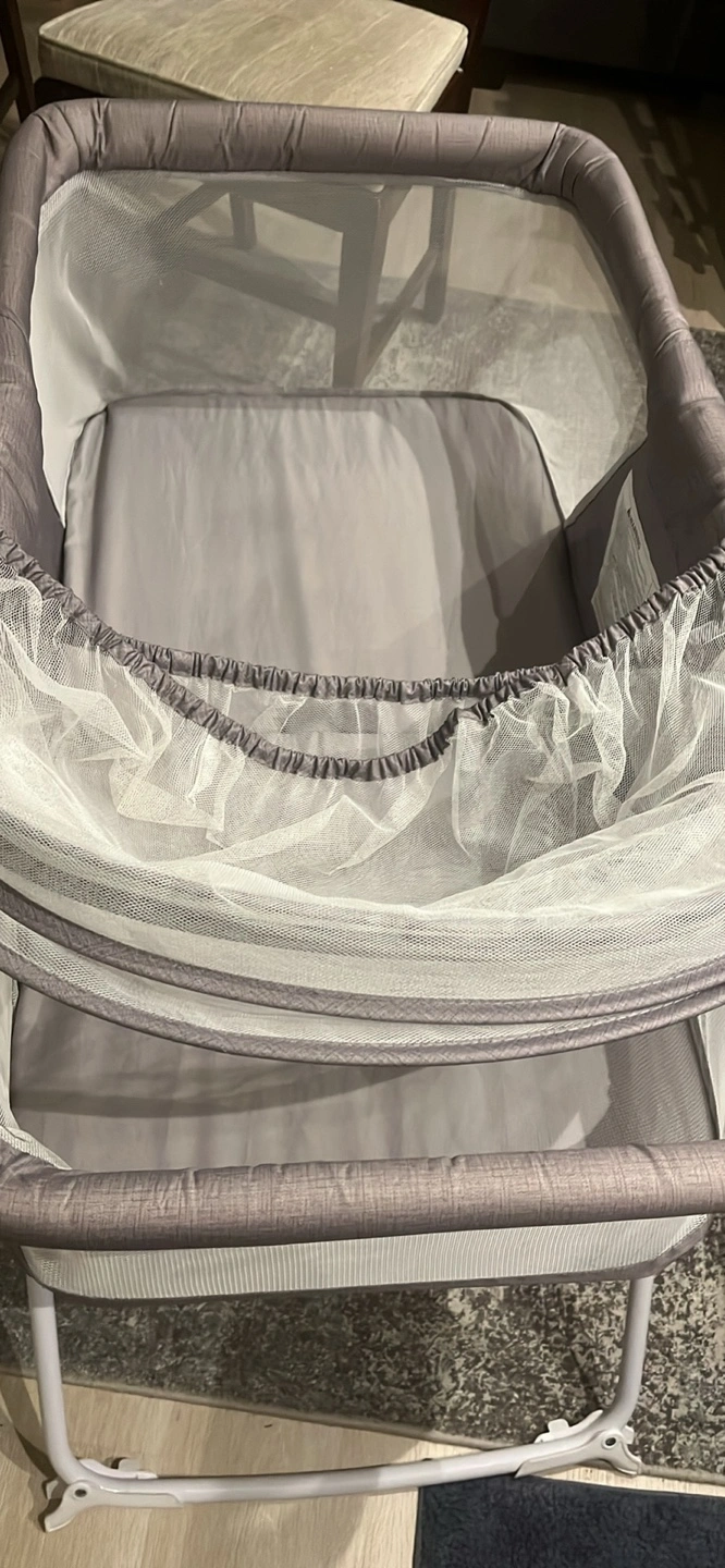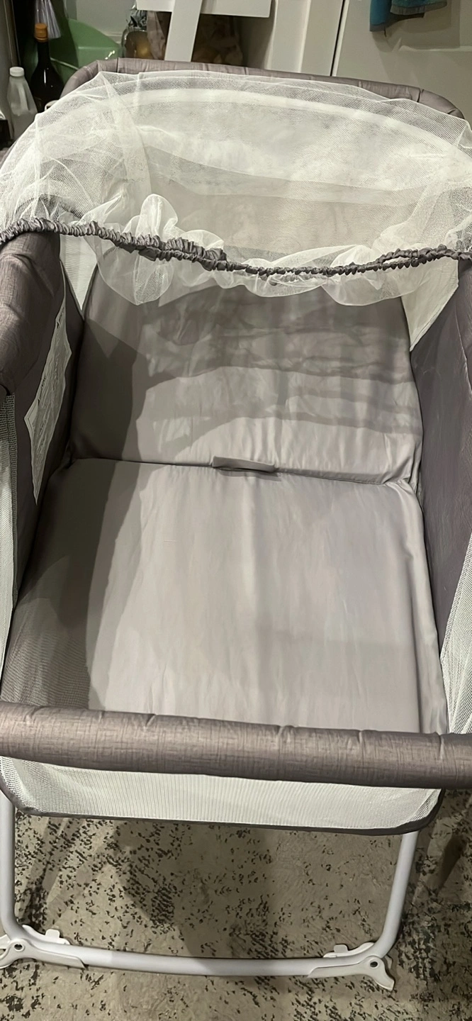Selling a Cosco baby bassinet in great condition! It's perfect for newborns up to a few months old. It comes with a mosquito net to keep your little one safe and sound while they sleep. The neutral grey colour will fit in with any nursery decor