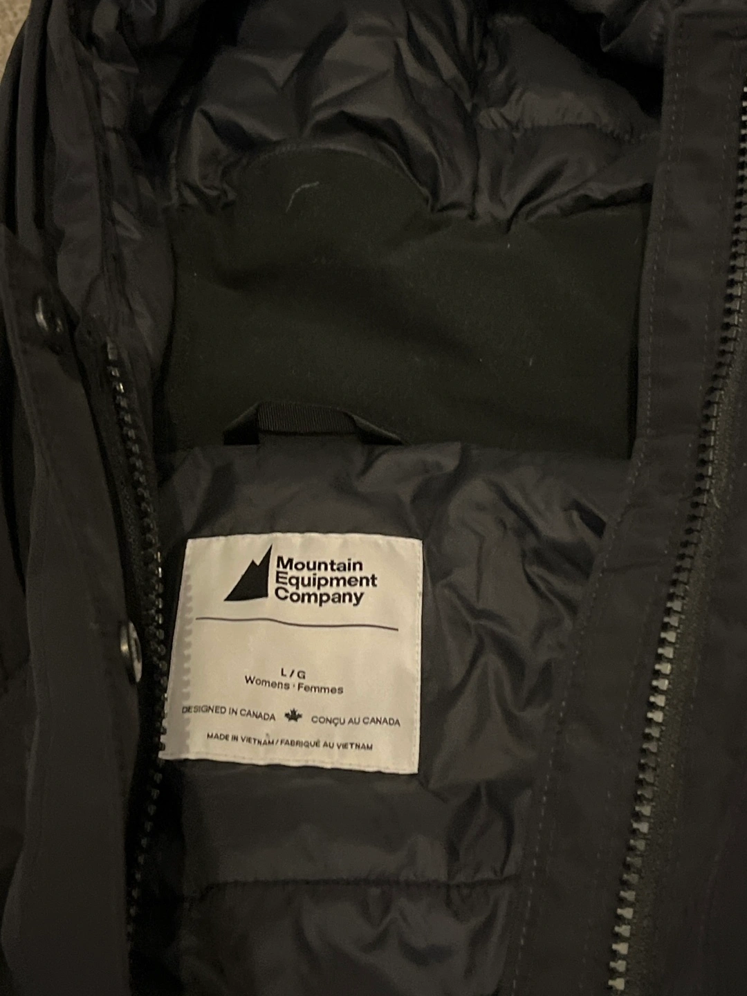 Selling a Mountain Equipment Company (MEC) women's coat in size large. It's a stylish and functional piece in classic black, perfect for staying warm and dry.