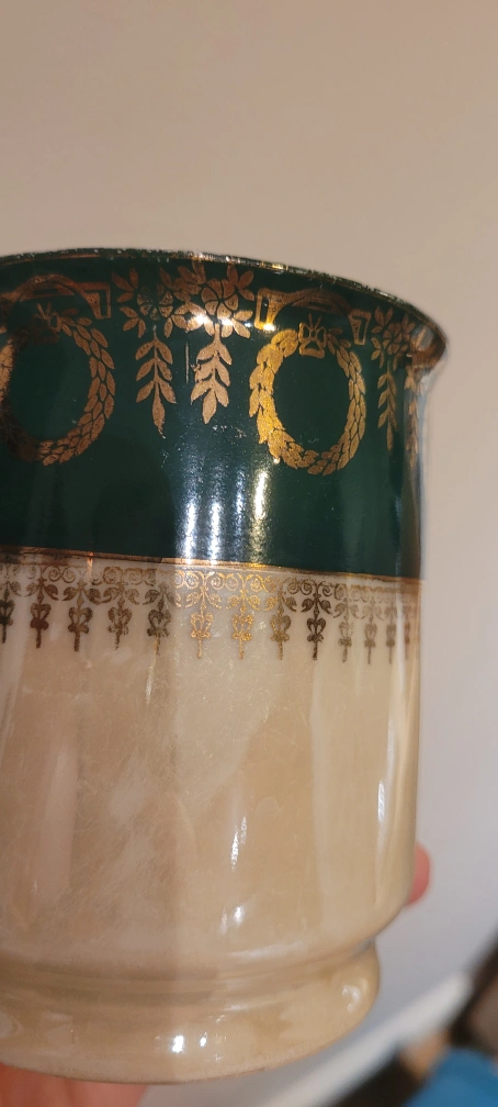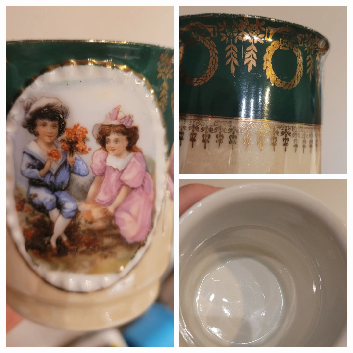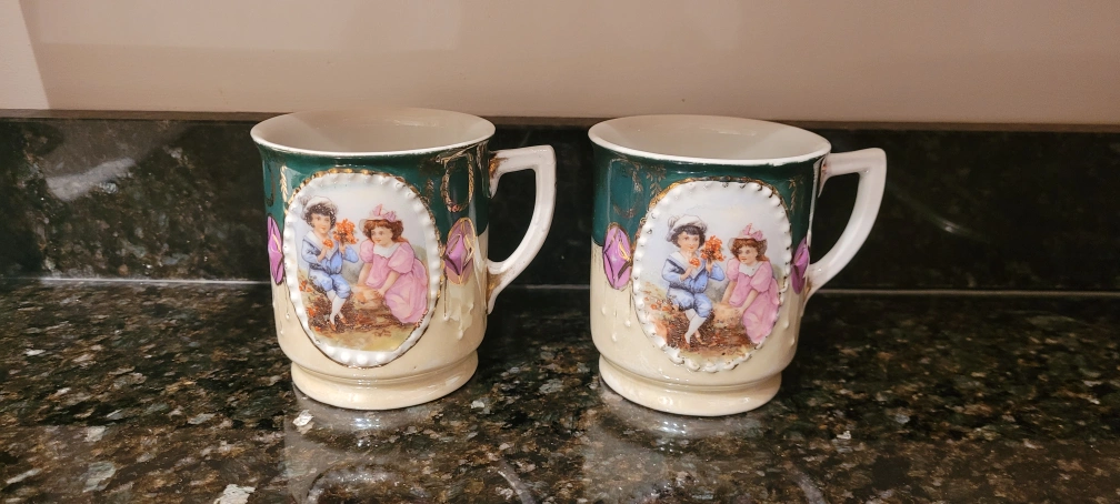 Selling a set of two vintage decorative mugs. They feature a charming design with children and floral accents. The mugs have a green and gold trim and are in great condition no chips or cracks or crazing Yonge and Finch area