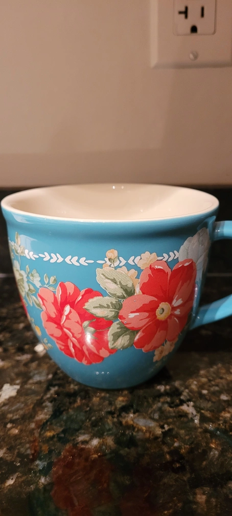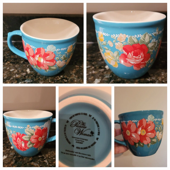 New Pioneer Woman stoneware mug Features a lovely floral design on a turquoise background. It is also dishwasher and microwave safe. Yonge and Finch area