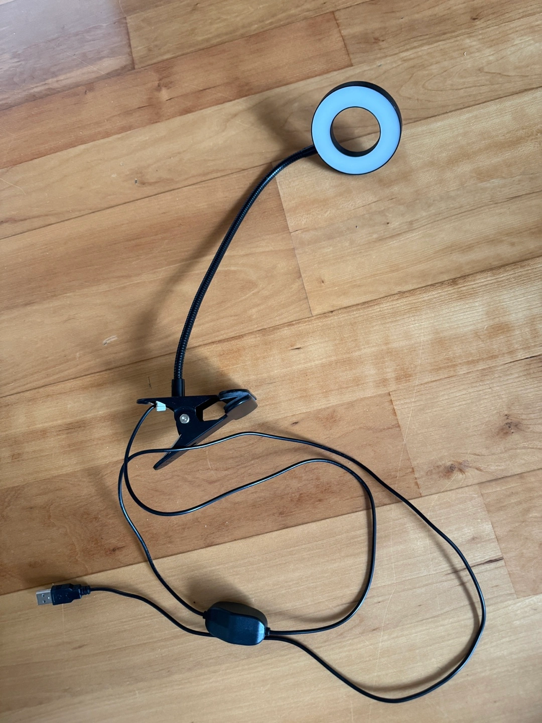 Selling a handy clip-on LED ring light! It's perfect for adding some extra brightness to your video calls or for taking better photos. It's in great condition and ready to use. Light colors in white and amber as options.