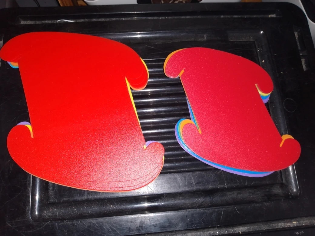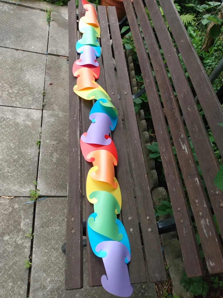 new 2 sizes, 13 inch or 10 inch plastic pieces fit together as a garland or whatever creative ideas you have each pkg has 30 pieces new red, orange yellow green blue and purple $10 a pkg 13