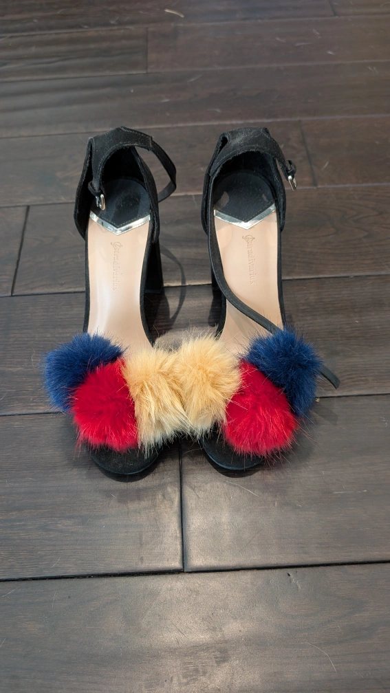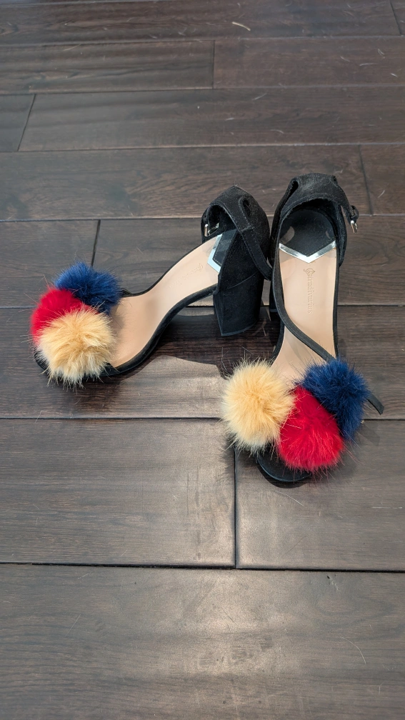 These fun heels from Stradivarius are sure to add a pop of colour to any outfit! They're a size 7 and feature adorable pom poms in red, yellow, and blue. Perfect for a night out or a special occasion
