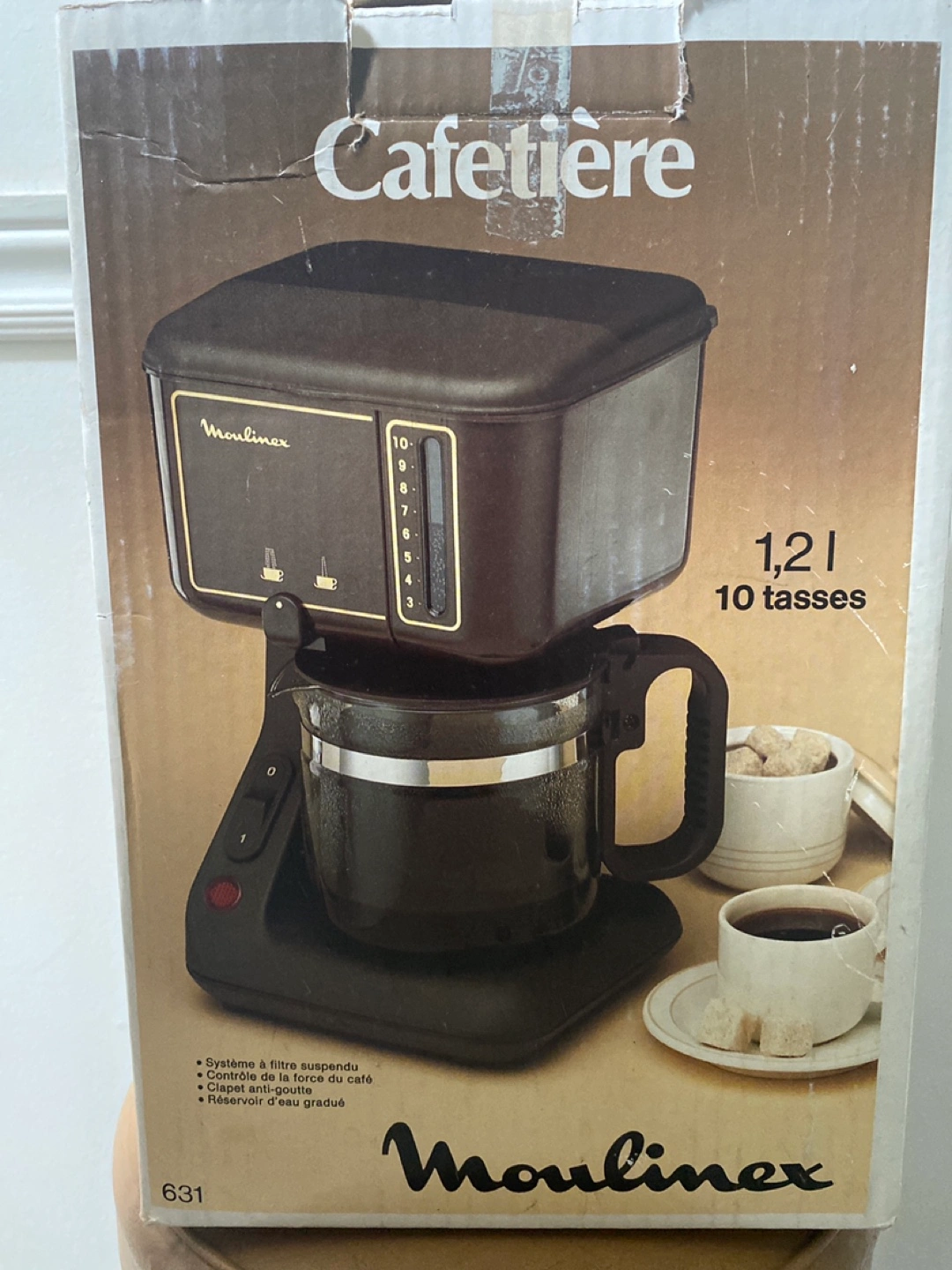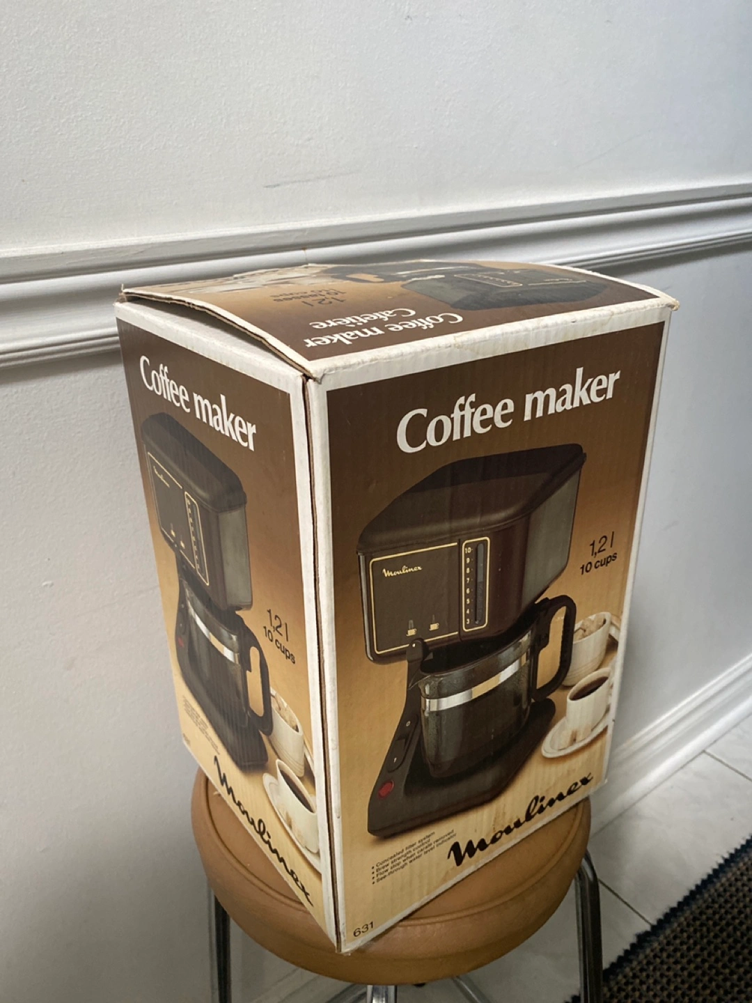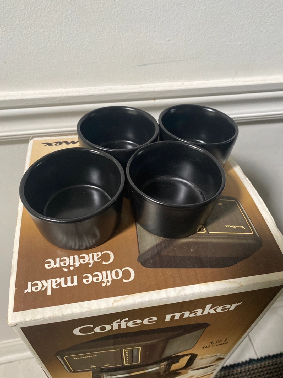 Selling a vintage Moulinex Cafetière coffee maker! It's in great shape and comes with the original box. This coffee maker can brew up to 10 cups (1.2L). A great addition to any kitchen! Comes with 4 black ceramic cups with no handles.
