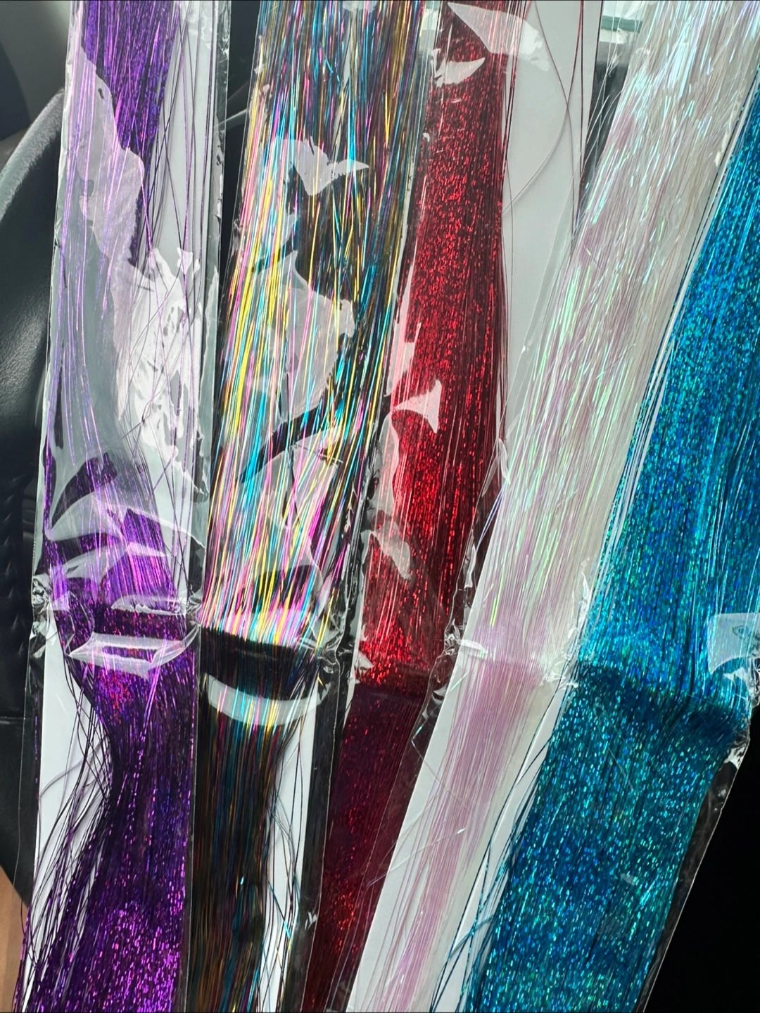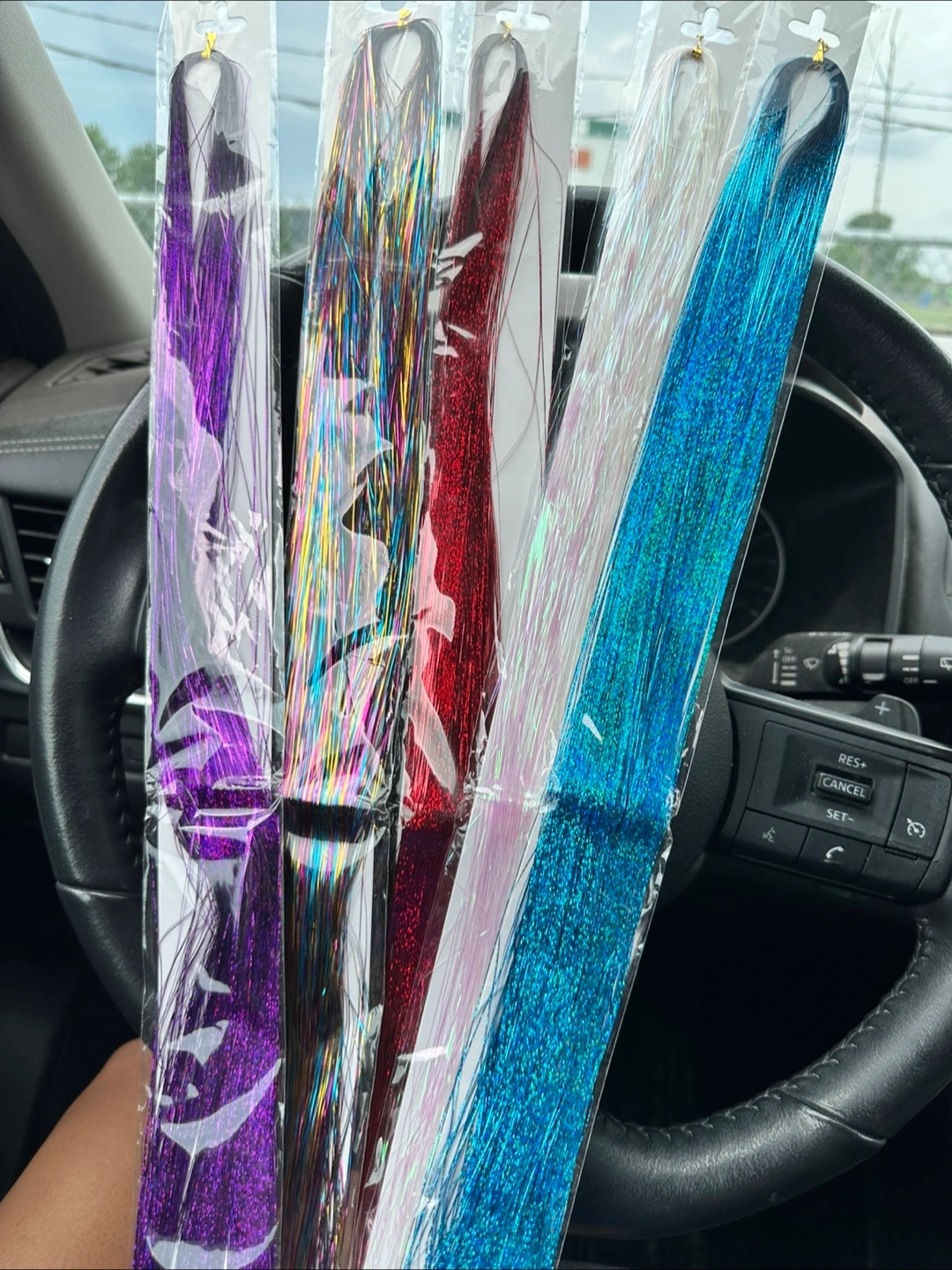 Add some sparkle to your hair with these fun tinsel strands! They come in a variety of colours, including purple, holographic, red, white, and blue. Easy to attach and perfect for adding a bit of flair to your everyday look or for special occasions $1 each.