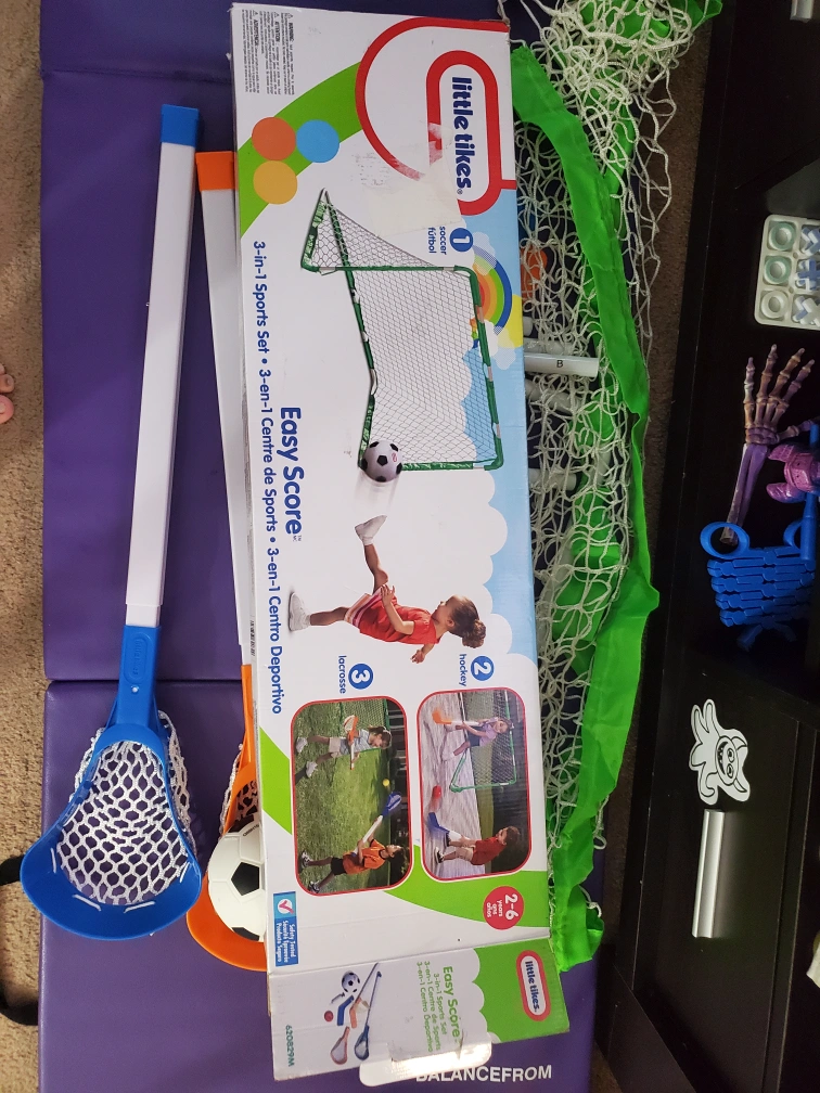 Get your little one moving with this Little Tikes Easy Score 3-in-1 Sports Set! It's perfect for kids aged 2-6 years. This set includes everything needed to play soccer, lacrosse, and hockey. It's a great way to encourage active play and develop coordination skills. The box is included!