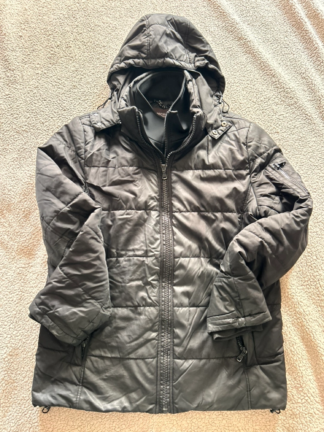 Michael Kors Quilted Winter Jacket $155 My last price is $125 Preloved and in great condition except for some wear marks on the sleeve cuffs and has been repaired on the inside (please refer to pics for the wear marks and size measurements) Size Medium Colour Black Has double zipper Has press buttons for neck area Has warm lining on the interior All zippers works perfectly Has hoodie with zipper insert Hoodie has a pull cord Back is plain and simple All and all a great comfy winter jacket This kind of jacket is ideal for winter or chilly fall days, combining both fashion and function. Pickup near wonderland or shipping is available Purchase worth $40 of any items and receive a free gift.