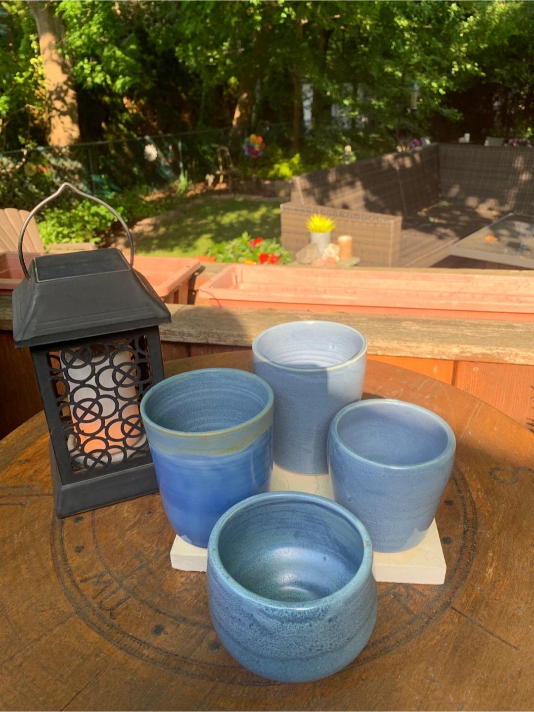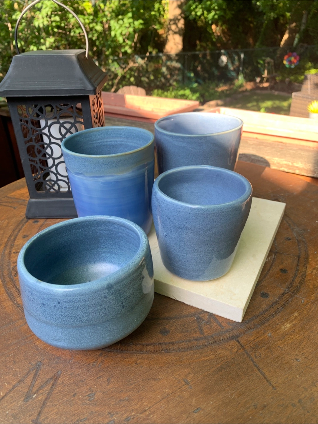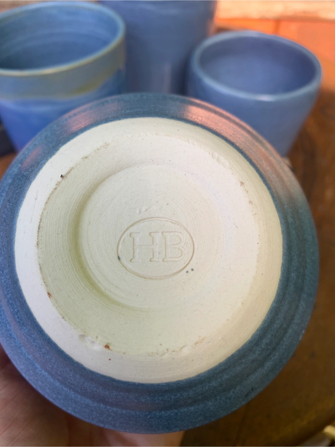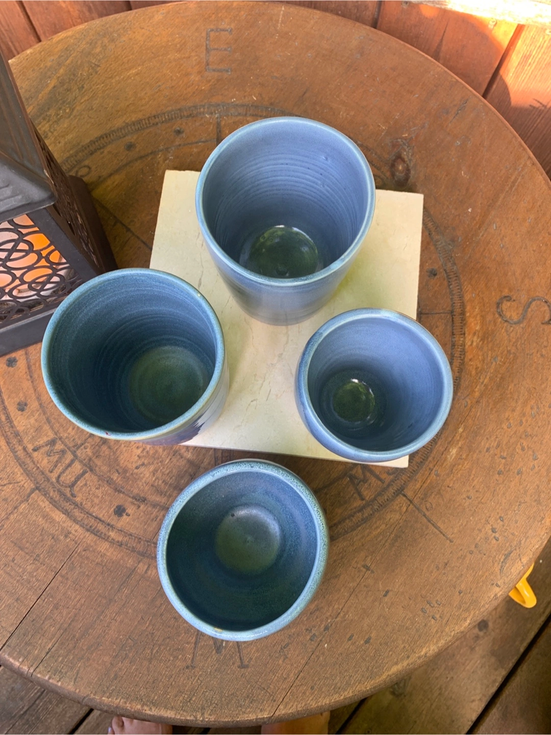 Selling a set of four handmade pieces of pottery in shades of blue. 💙🩵They're all in a lovely shade of blue and have a unique, handcrafted feel. The bottoms are marked with 'HB'. No chips or cracks on them. Perfect for adding a touch of artisanal charm to your kitchen or as a gift for a pottery lover! Would look lovely as a grouping on a bookshelf or coffee table! Props not included. Cash only please.