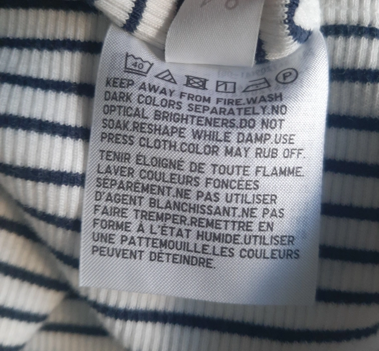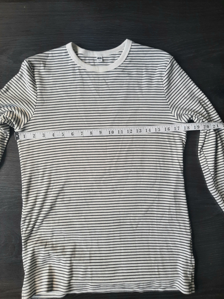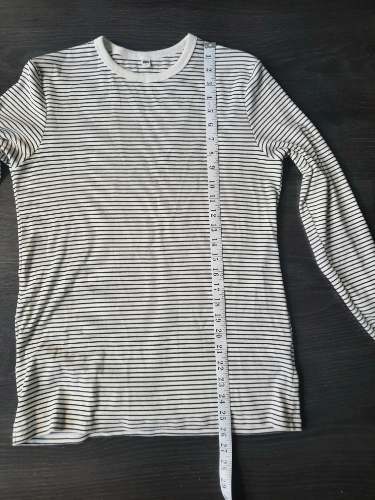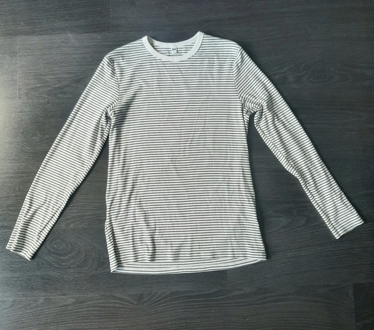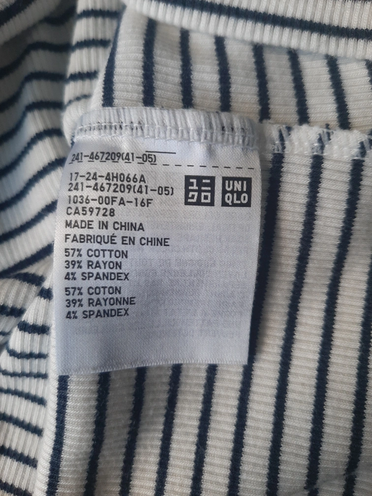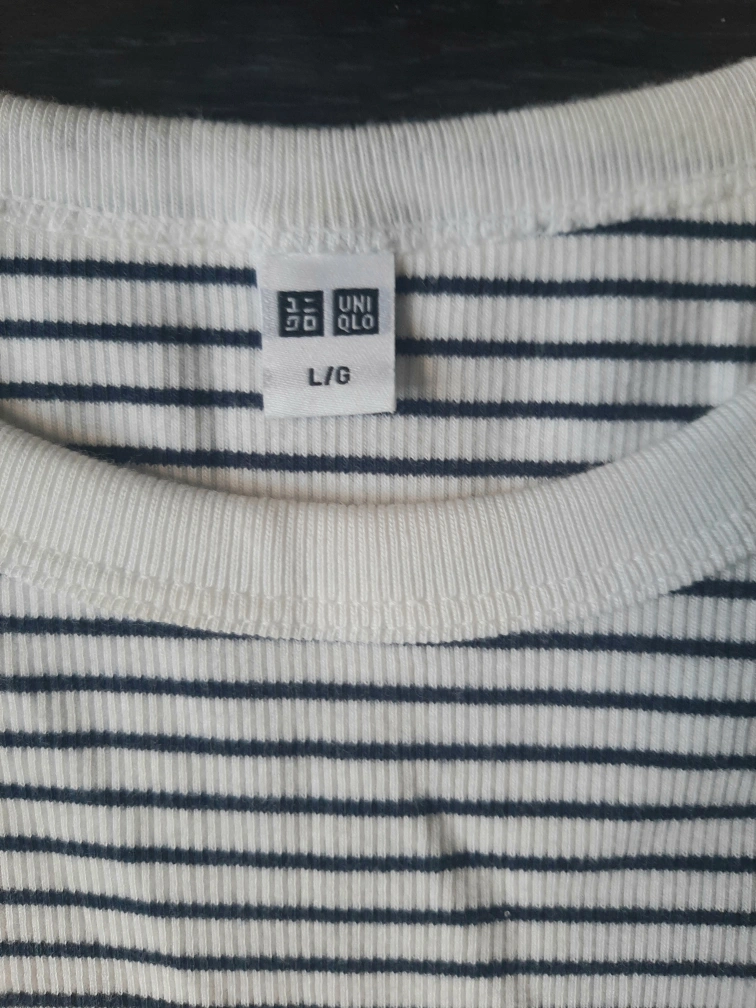 Here's a Uniqlo long sleeve top with a classic striped design! It's a size L and made from a blend of 57% cotton, 39% rayon, and 4% spandex, making it super comfy. Perfect for layering or wearing on its own
