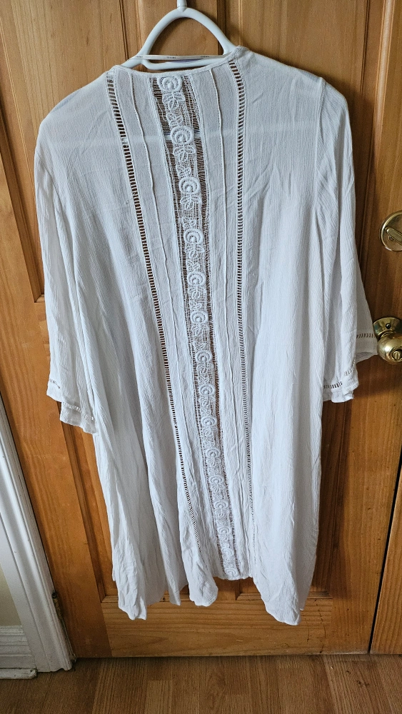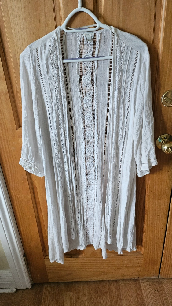 Selling a lovely white kimono from Forever 21! It's a size large and features beautiful lace detailing. Perfect for layering or wearing as a light cover-up! Available for pick-up near Oakwood Village.