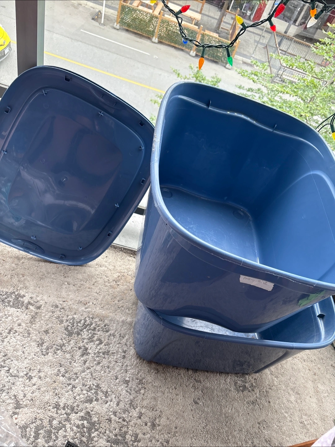 2 blue storage containers with lids. They're great for organizing your stuff and keeping things tidy around the house