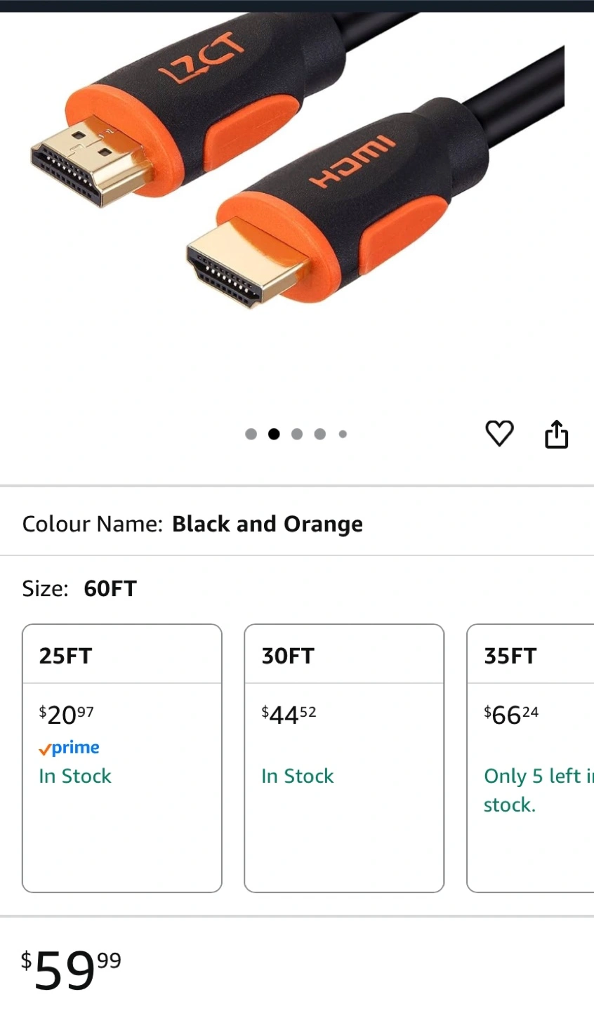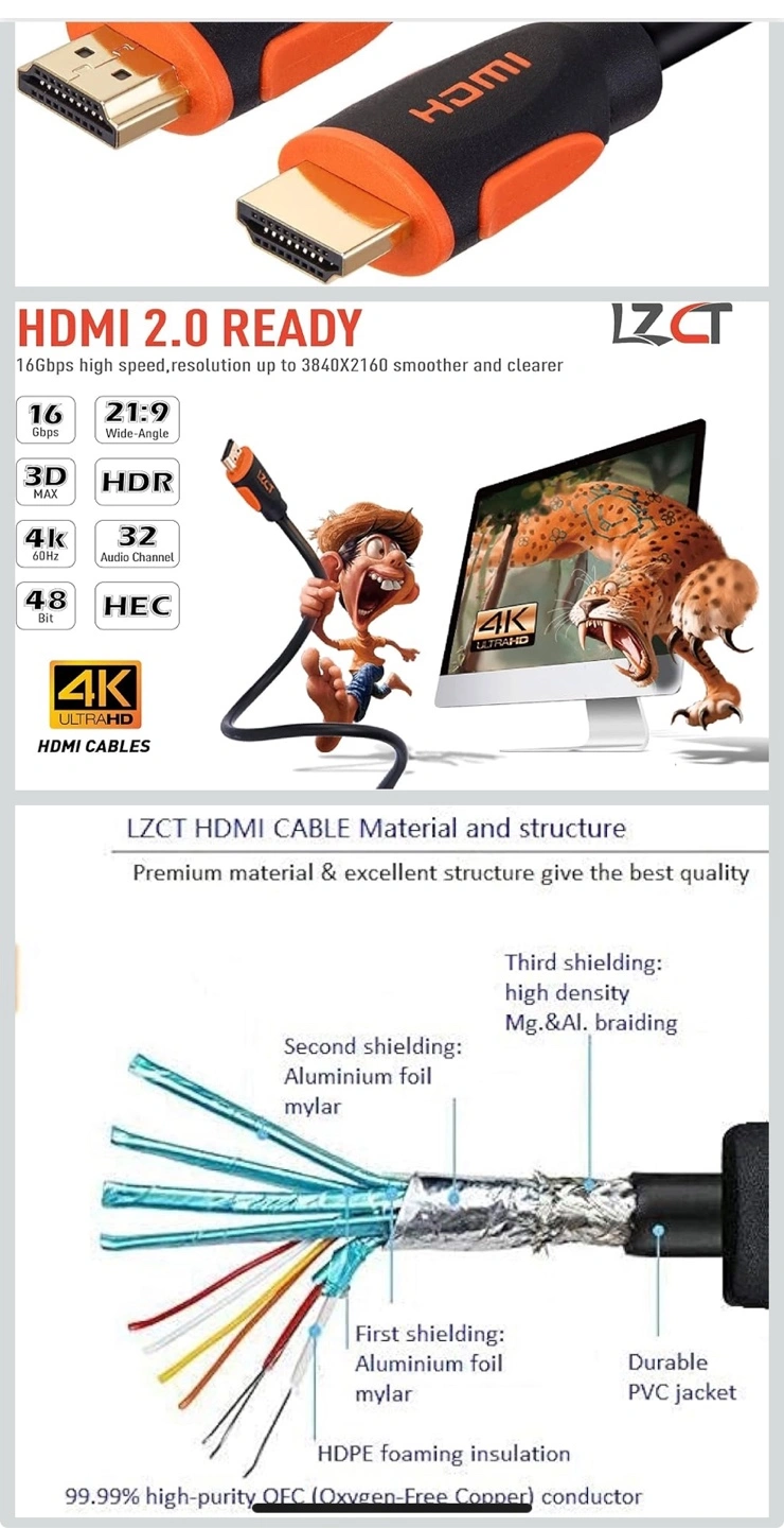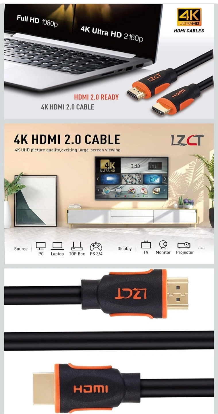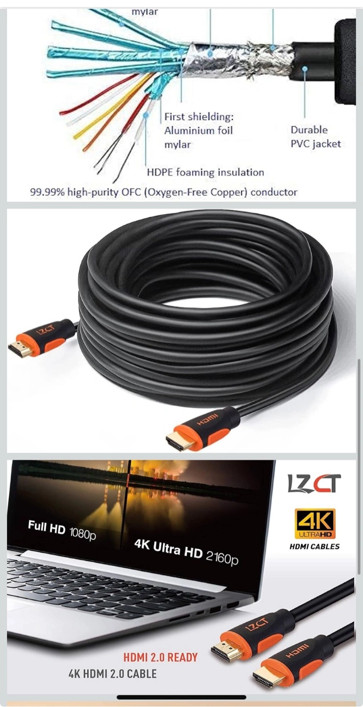 Selling a LZCT 4K HDMI 2.0 cable. It supports 4K Ultra HD 2160p resolution, ensuring a sharper and clearer picture. The cable is HDMI 2.0 ready and provides a high-speed connection up to 3840x2160. It also features a durable PVC jacket and 99.99% high-purity OFC (Oxygen-Free Copper) conductor for excellent signal transmission