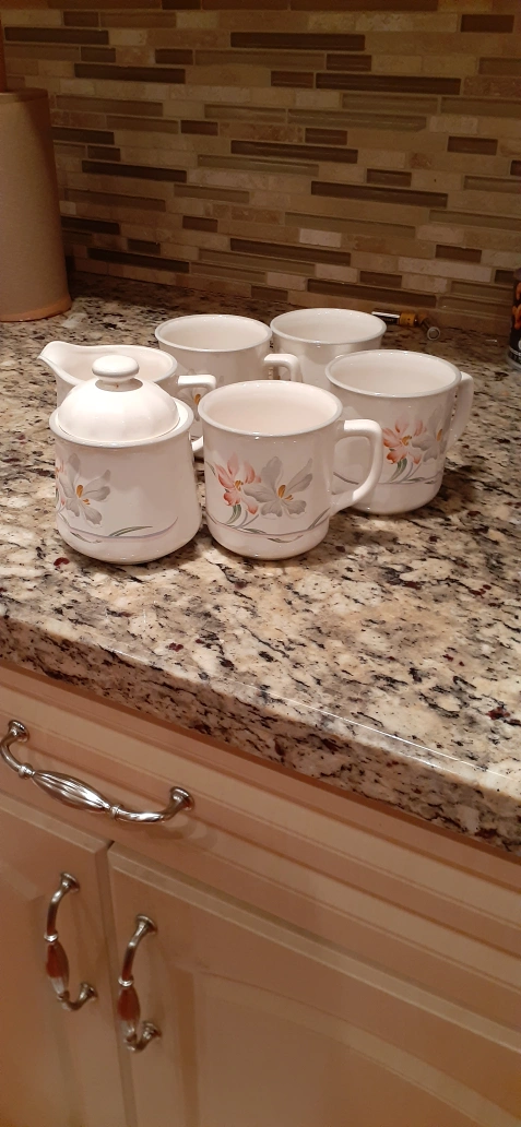 Here's a lovely coffee set with a delicate floral pattern! It includes a sugar bowl with a lid, a creamer, and four mugs. Perfect for adding a touch of charm to your morning coffee or tea time