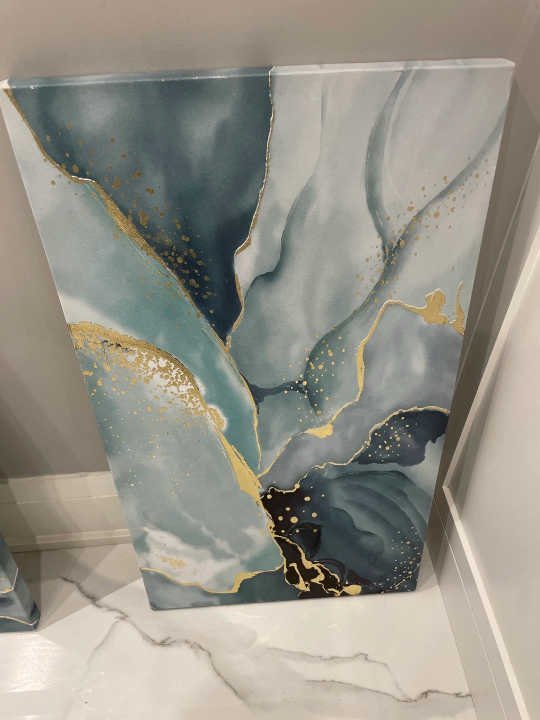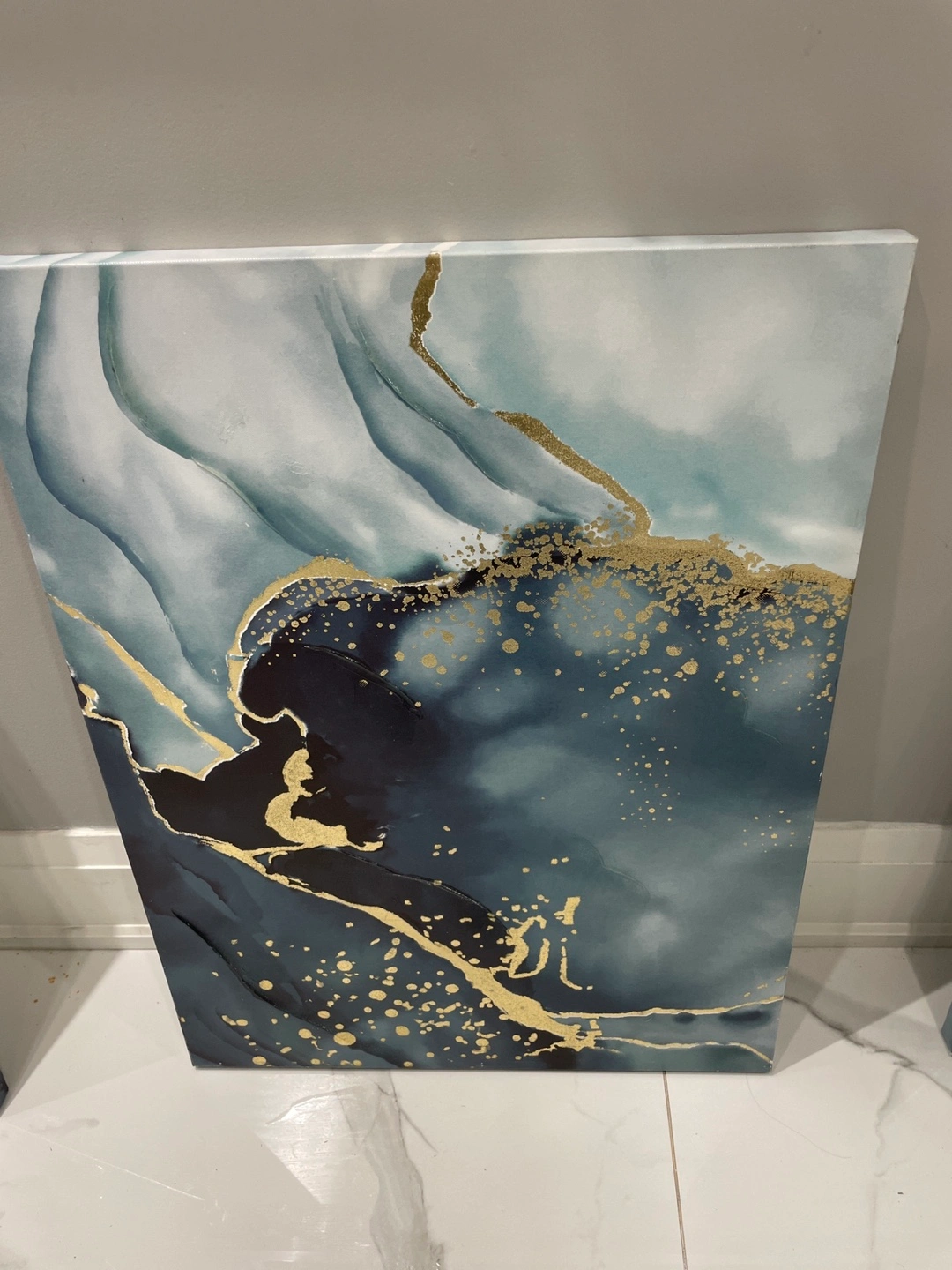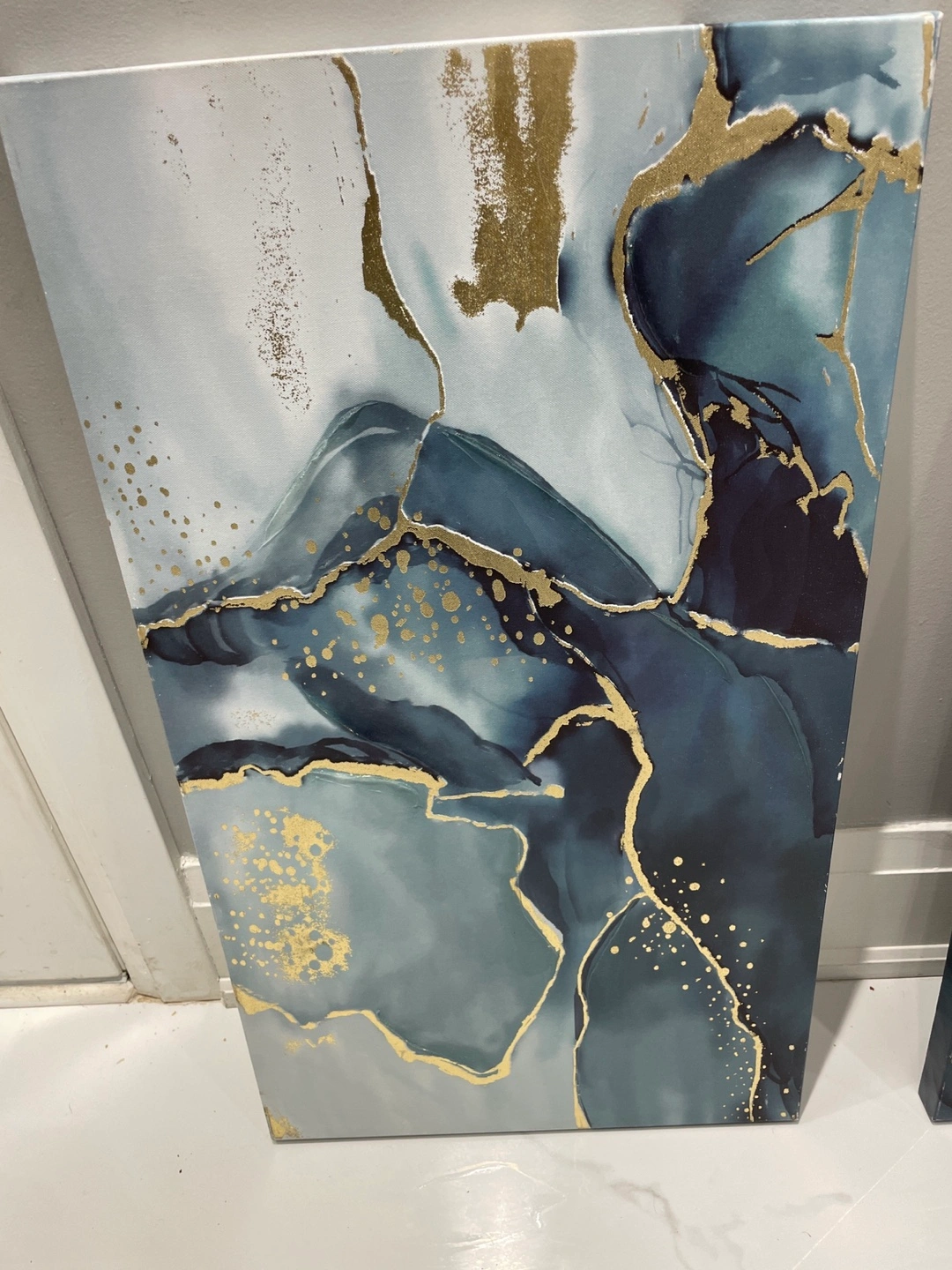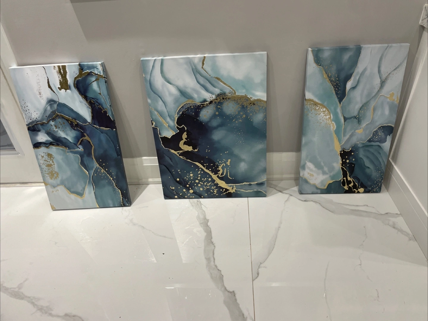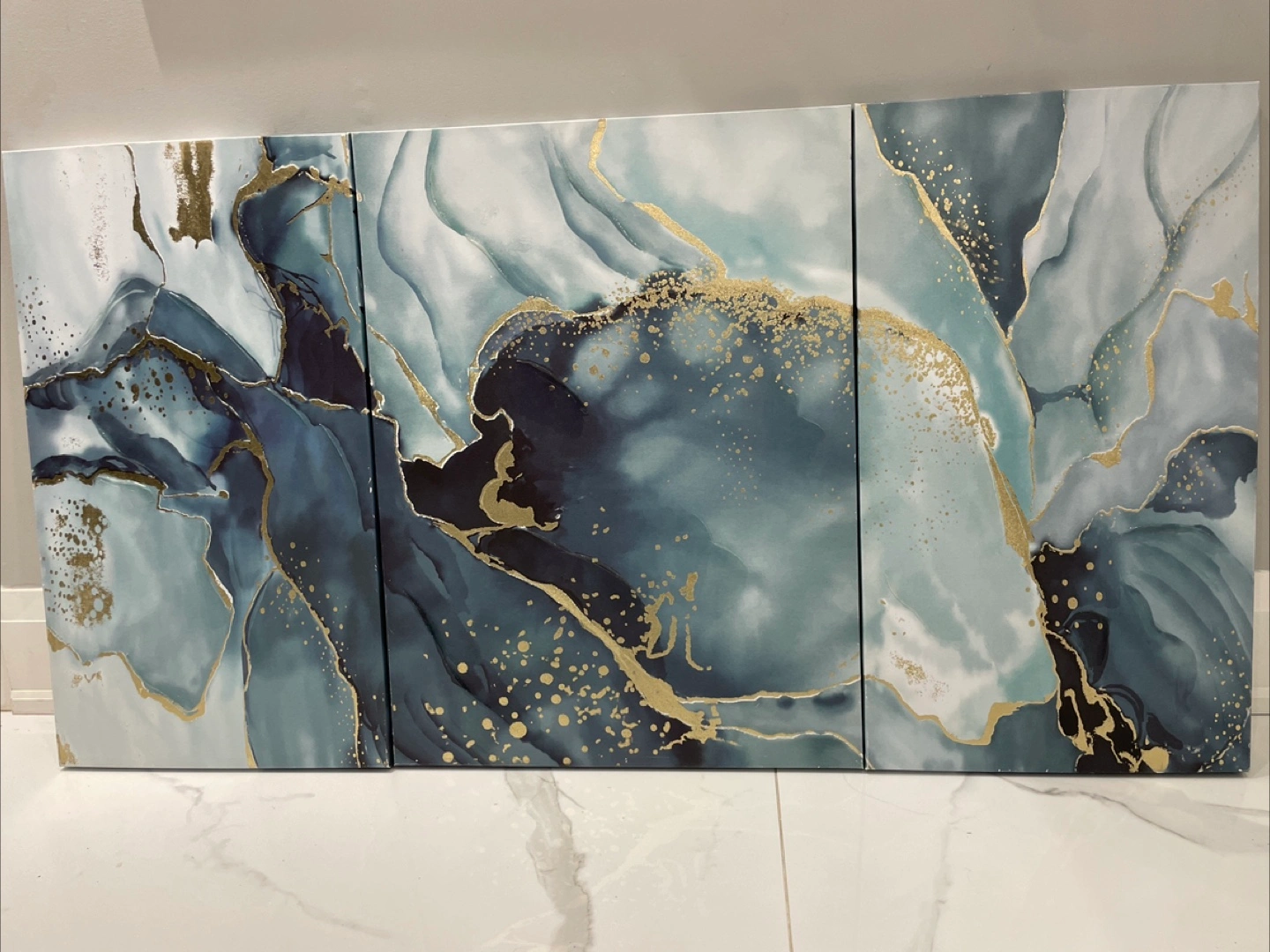 Selling a set of three abstract canvas wall art pieces. They feature a beautiful blend of blues, greys, and gold accents, adding a touch of elegance to any room. Perfect for creating a focal point in your living space or bedroom! Size: W x L 1. 45 x 80 cm 2. 60 x 80 cm 3. 45 x 80 cm