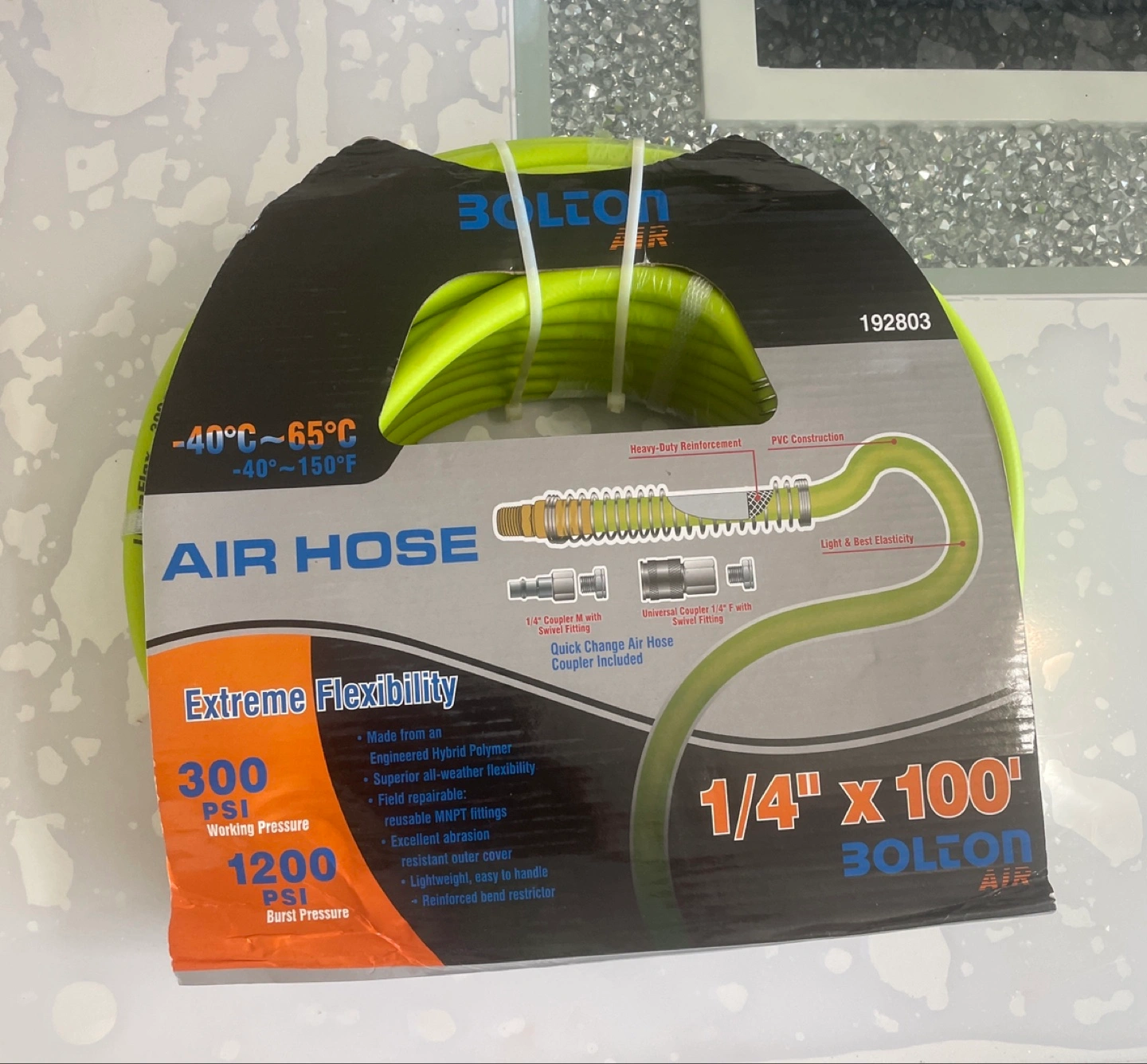 Selling a brand new Bolton Air 1/4" x 100' air hose! This hose features extreme flexibility and is made from an engineered hybrid polymer. It's super abrasion resistant and lightweight, with an easy-to-handle design. Also features reusable MNPT fittings and a reinforced bend restrictor BRAND NEW (NEVER OPENED) 35$