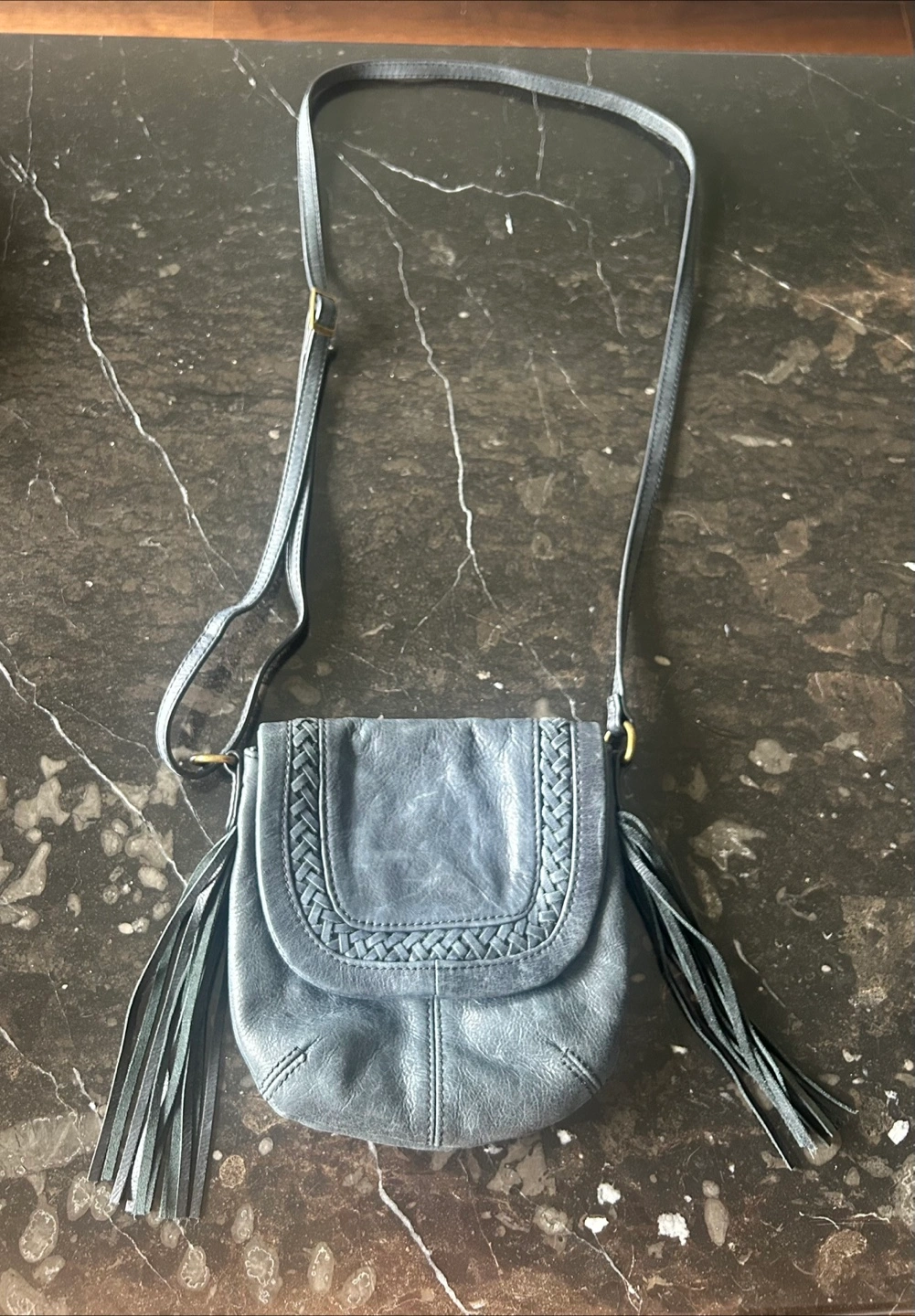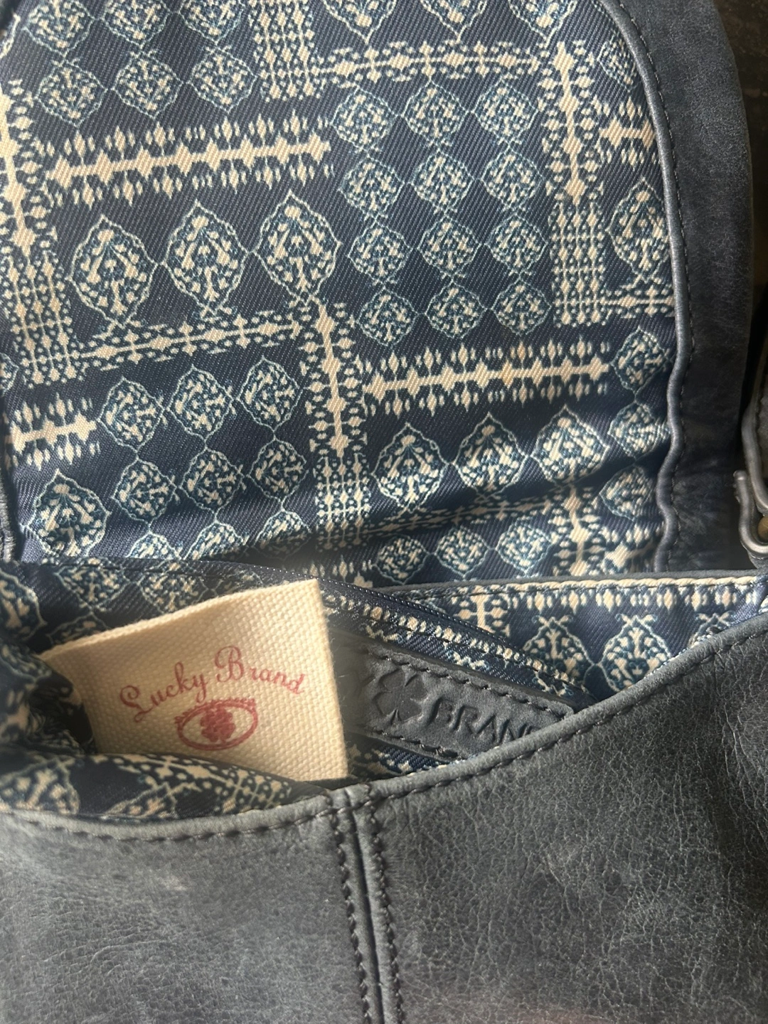 Lucky Brand leather crossbody purse. Good condition. Fringe detail. The interior is lined with a patterned fabric, and there's a zippered pocket inside. Slit pocket on back of bag.
