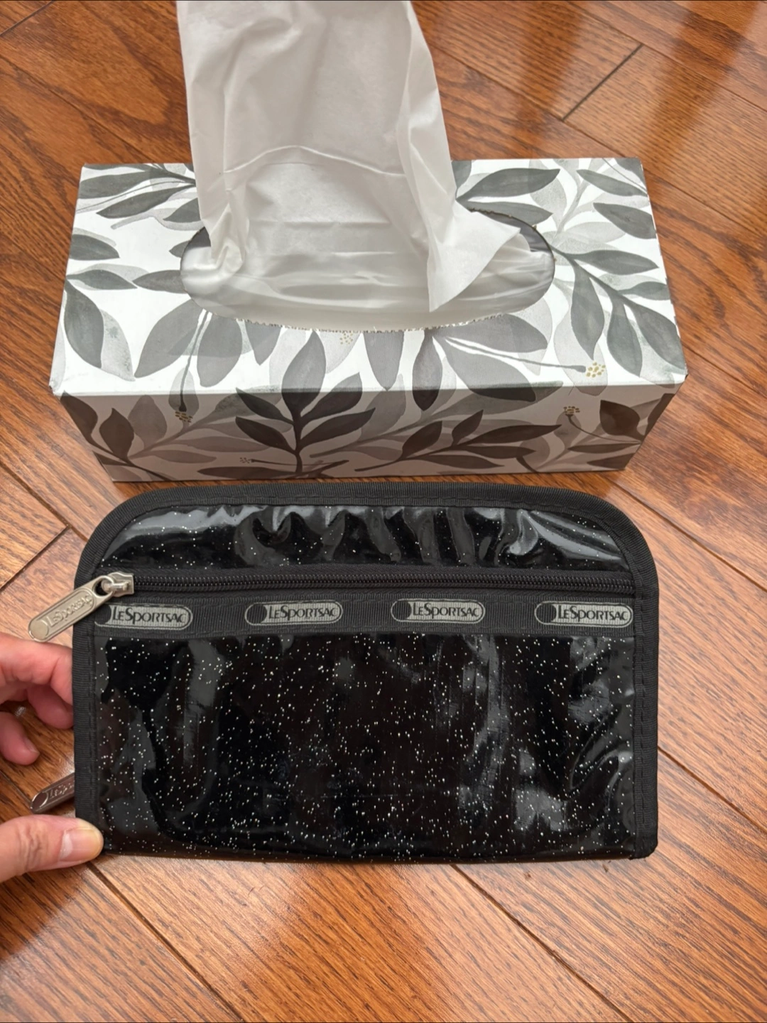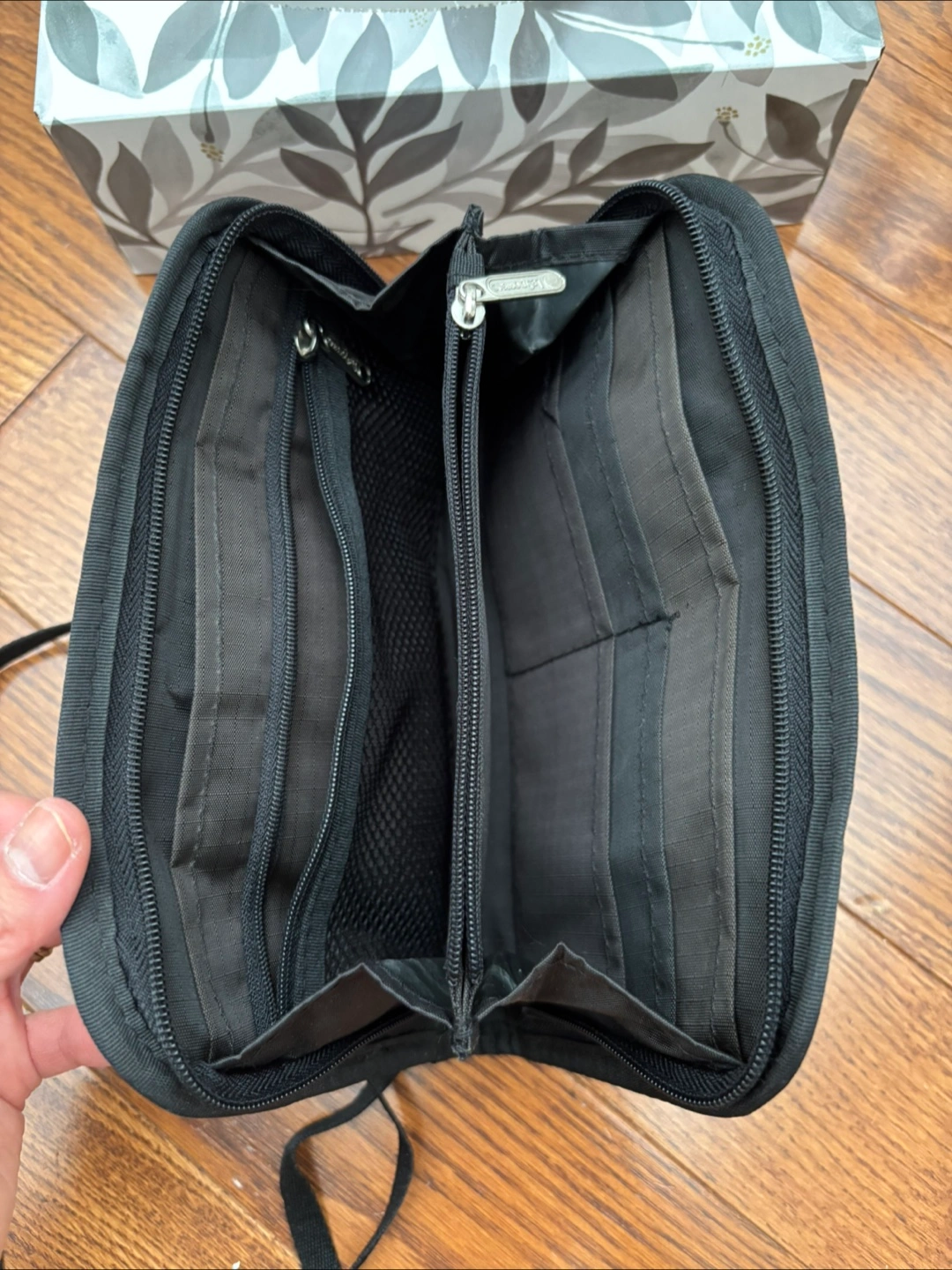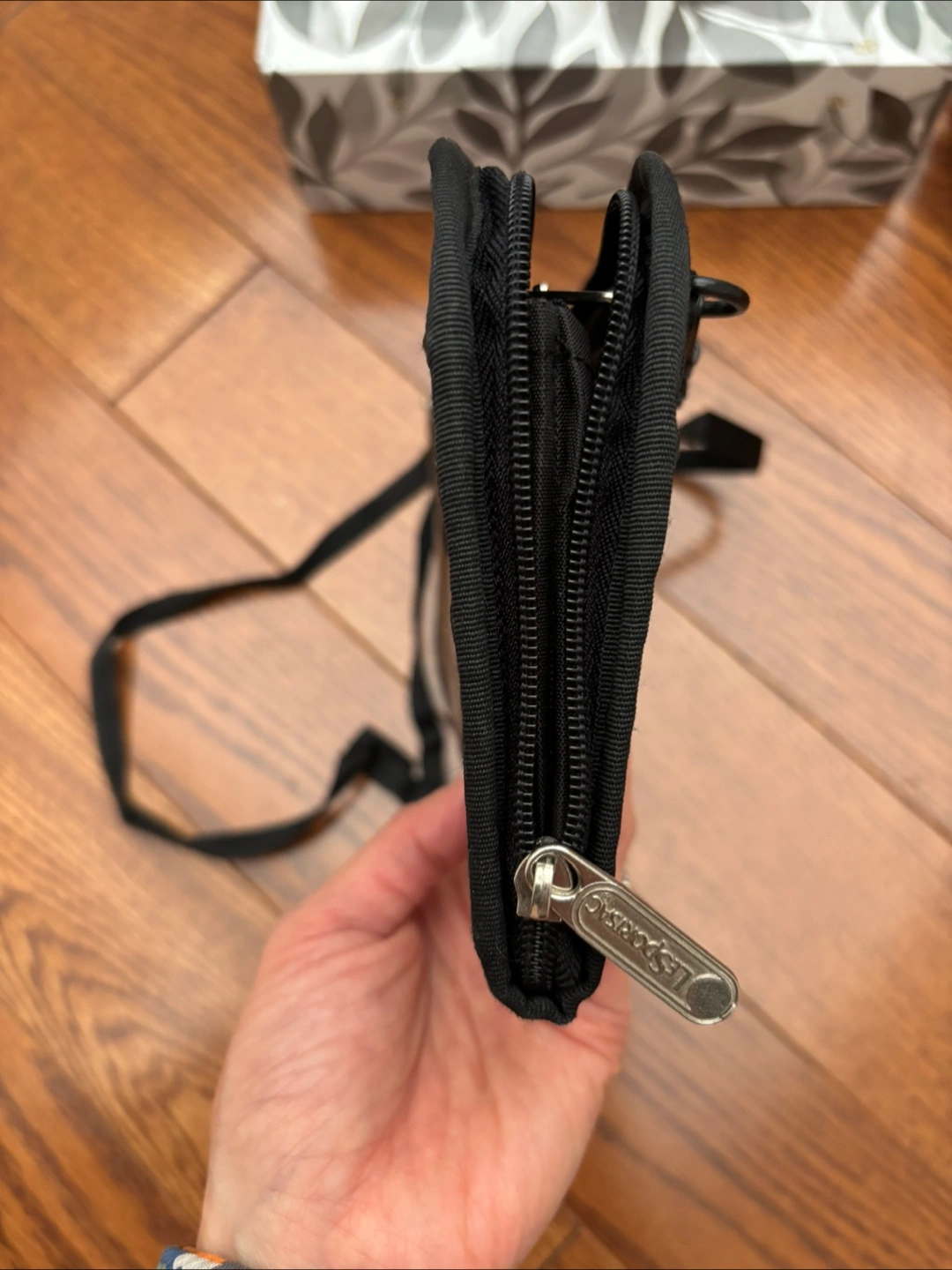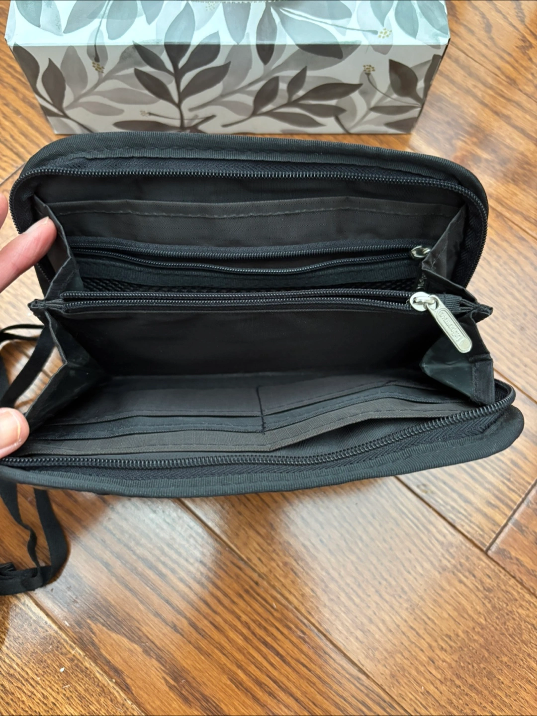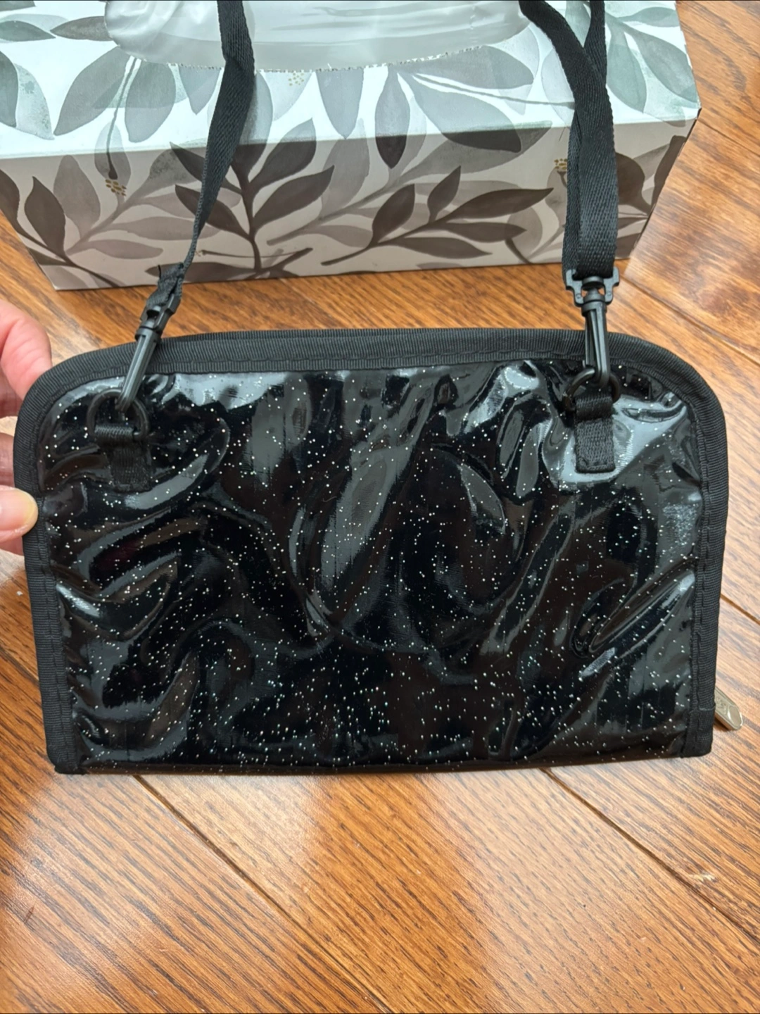 Smoke free pet free home Pick up only Yonge & Steeles Item brought to driveway Black glitter travel crossbody wallet Multiple pockets and zipper pockets ideal for travel documents, ID or credit cards, receipts, coins, feminine products Thin detachable strap which is also adjustable. Very light weight and great for errands