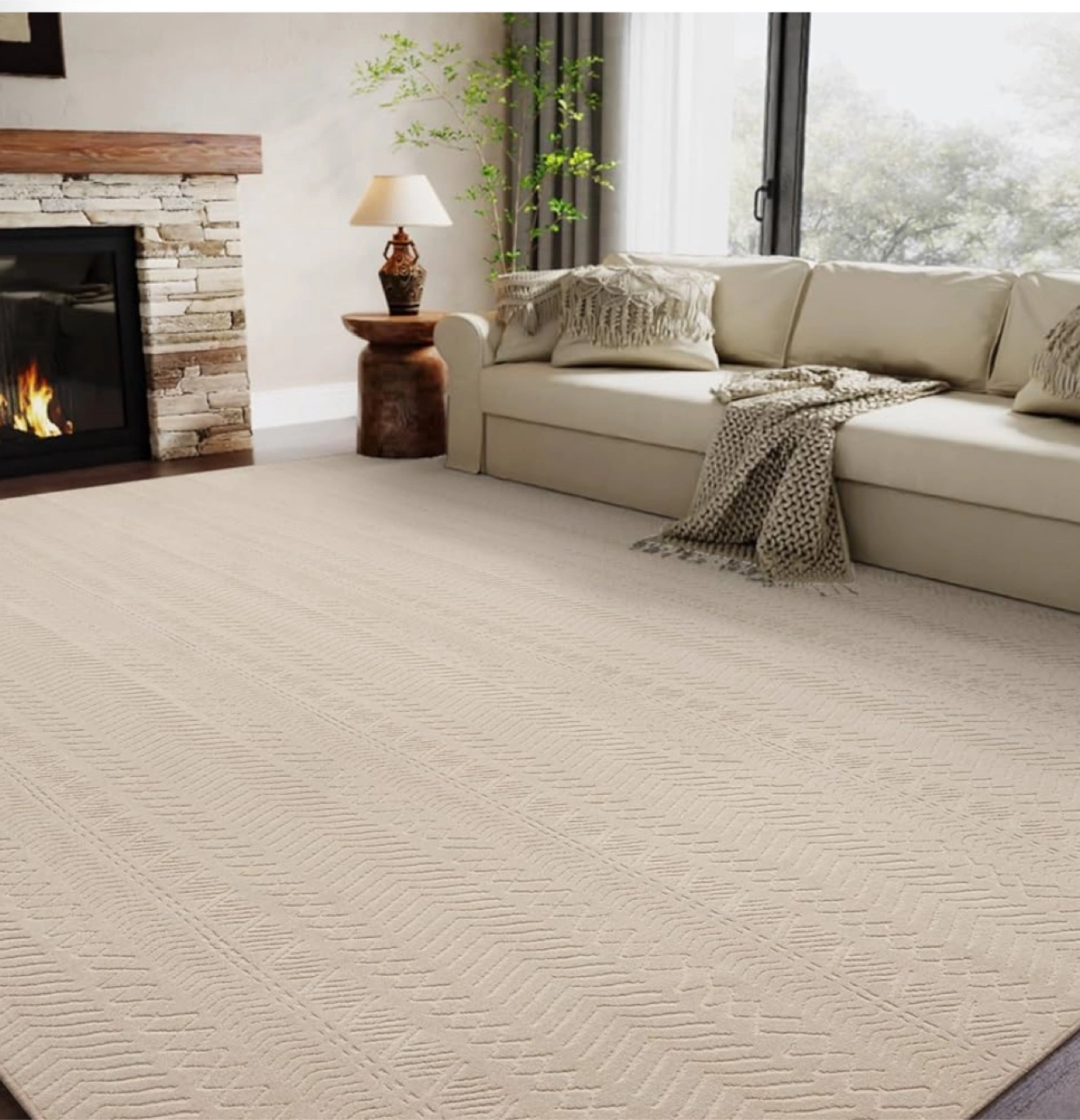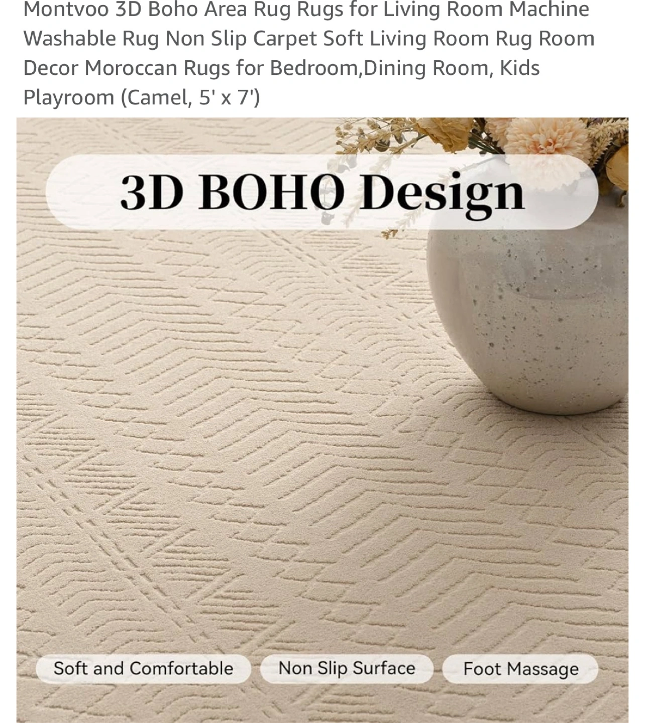 Selling a Montvoo 3D Boho area rug! This rug is a lovely camel colour and measures 5' x 7'. It's machine washable and has a non-slip back. The 3D boho design adds a nice touch to any room. Soft and comfortable underfoot, it's perfect for the living room, bedroom, or kids' playroom