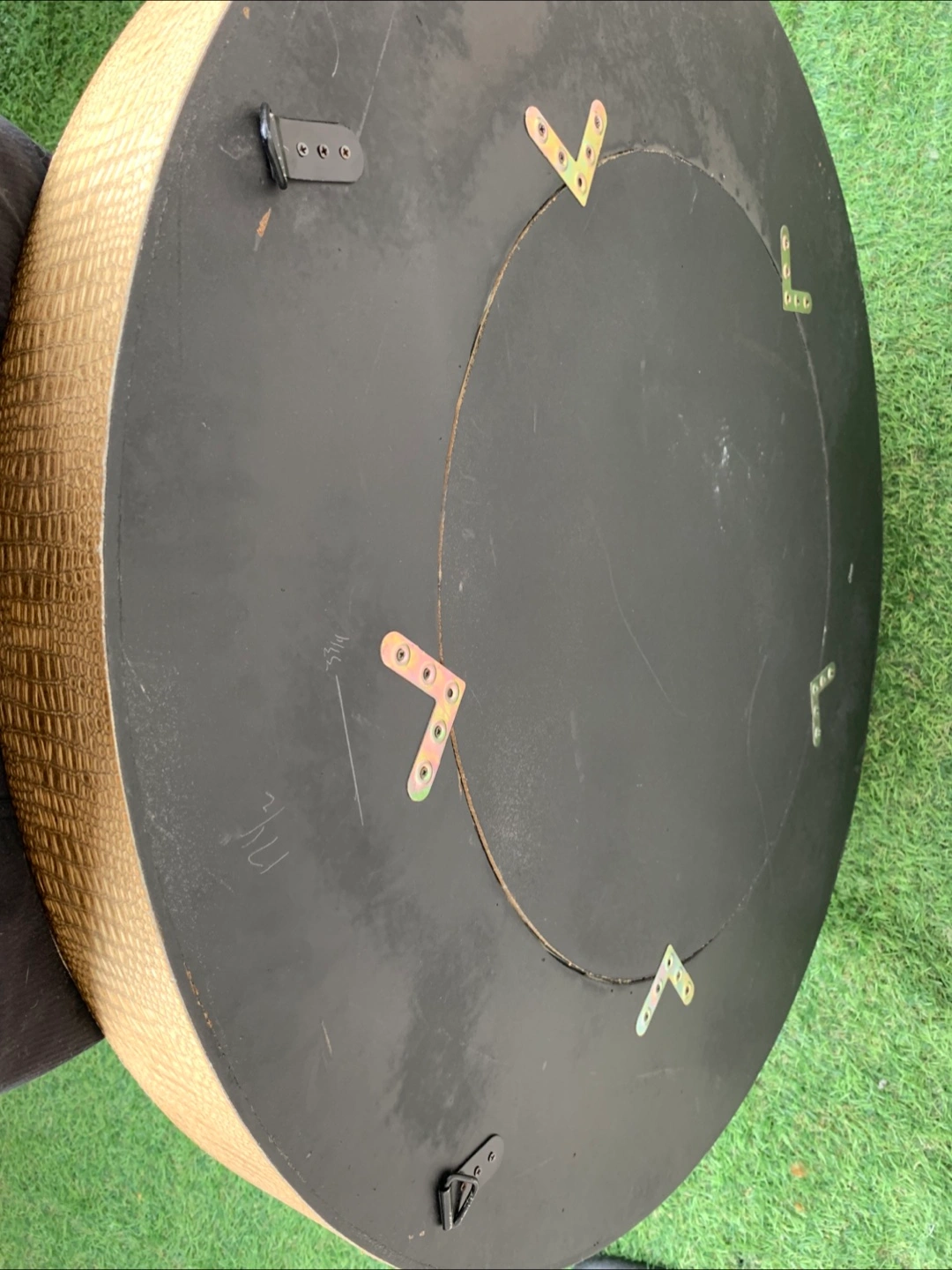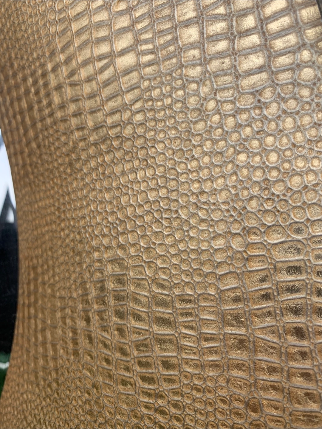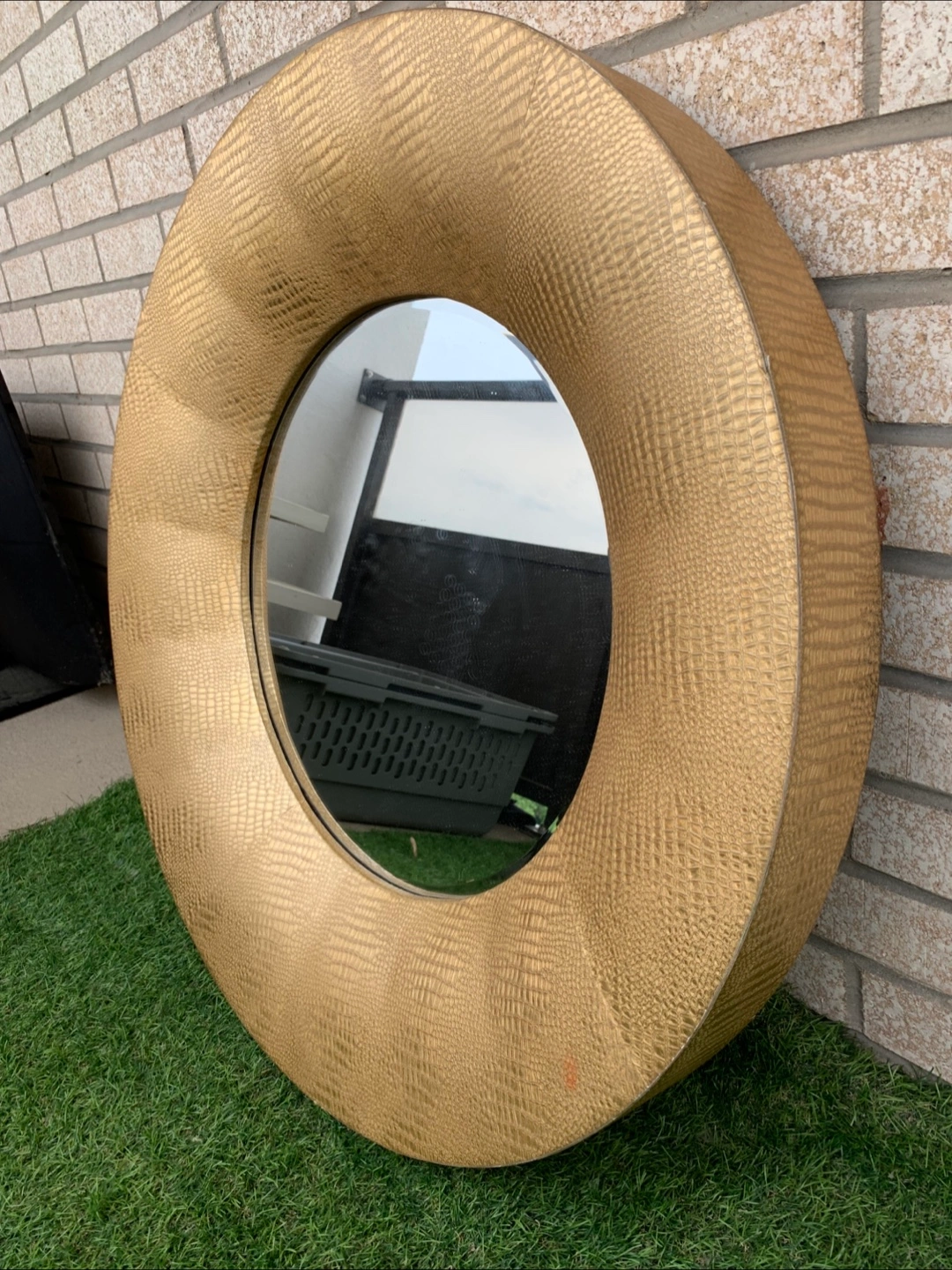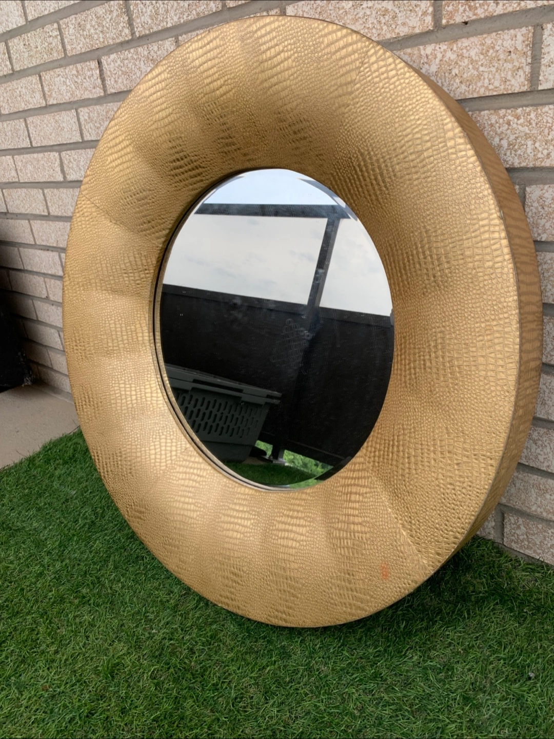 Selling a stylish round wall mirror with a unique gold, faux-crocodile skin finish. It's in great shape and ready to add a touch of elegance to any room