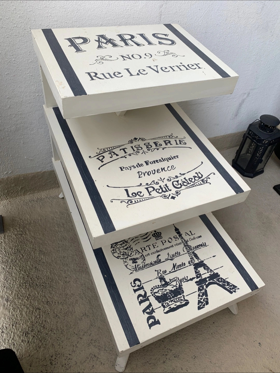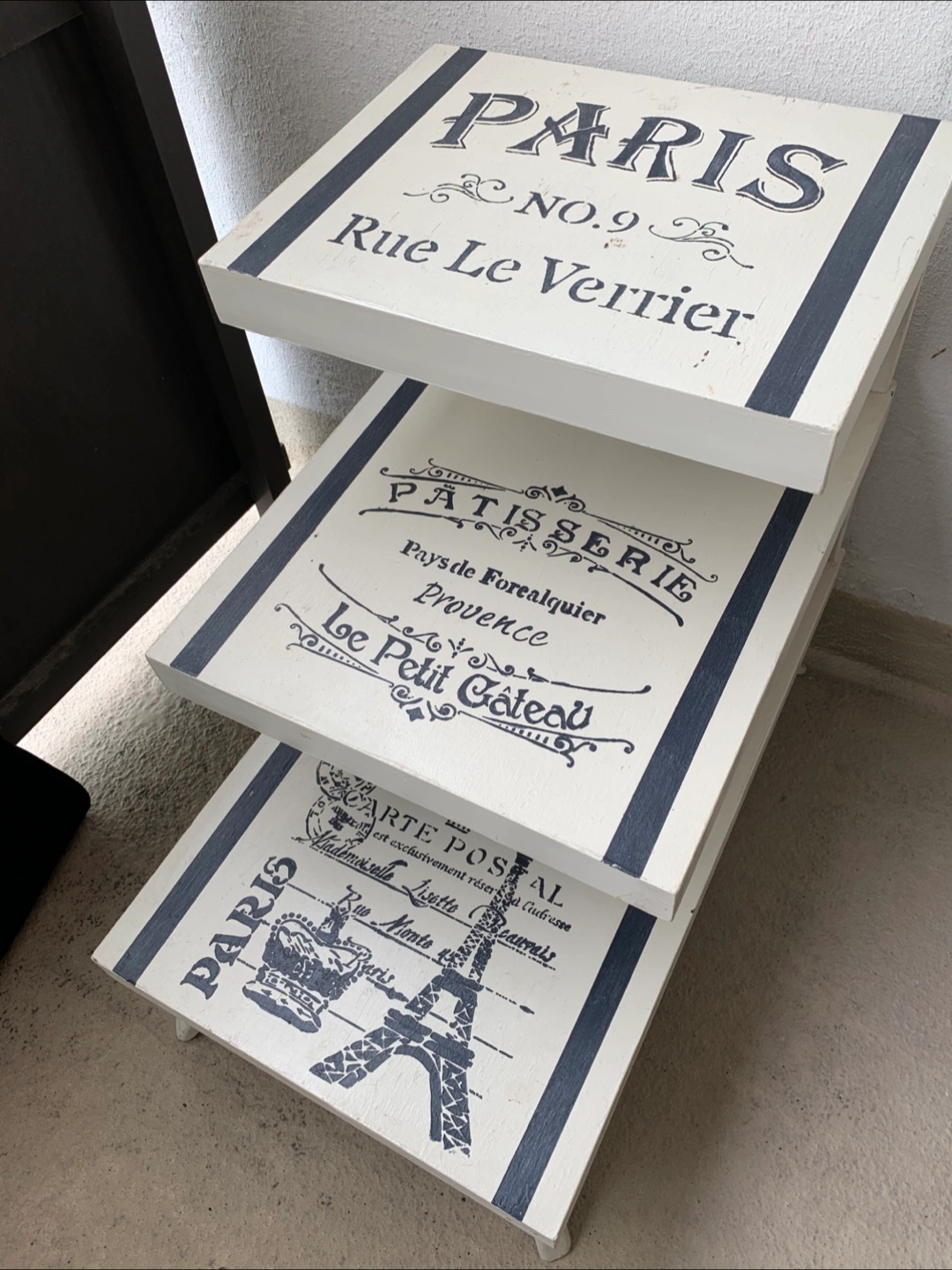 Here are some cute nesting tables with a Paris theme! They have a vintage look with French writing and illustrations on each tier. Perfect for adding a touch of Parisian charm to your home decor