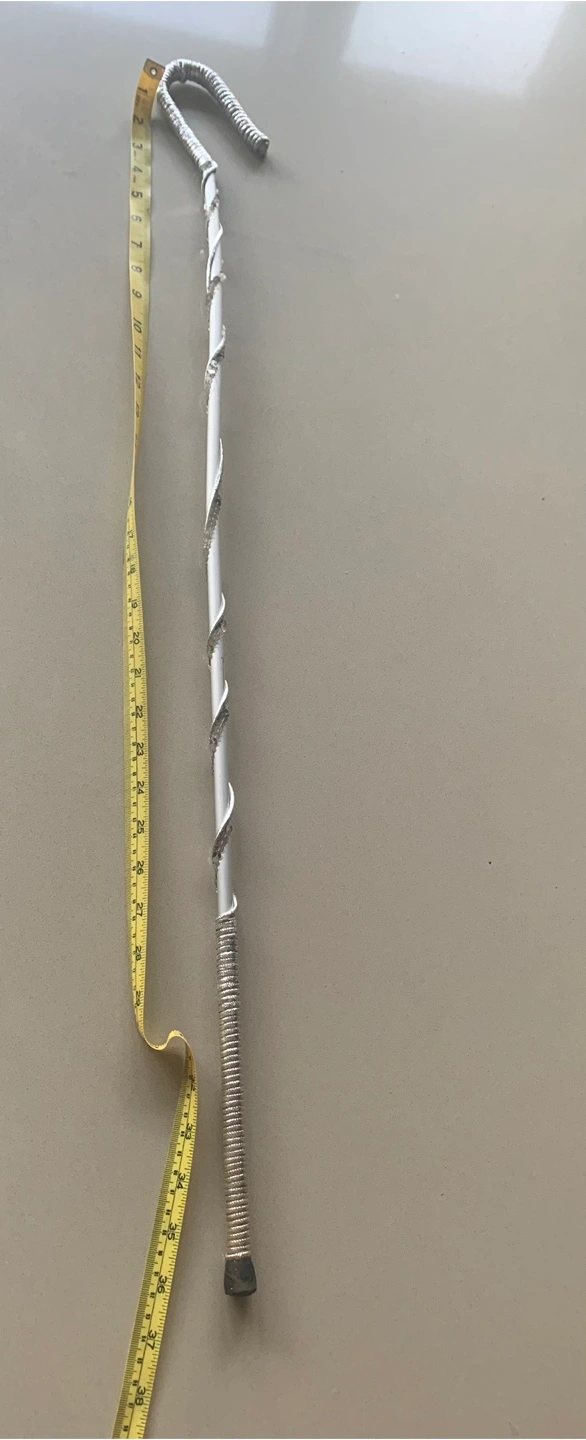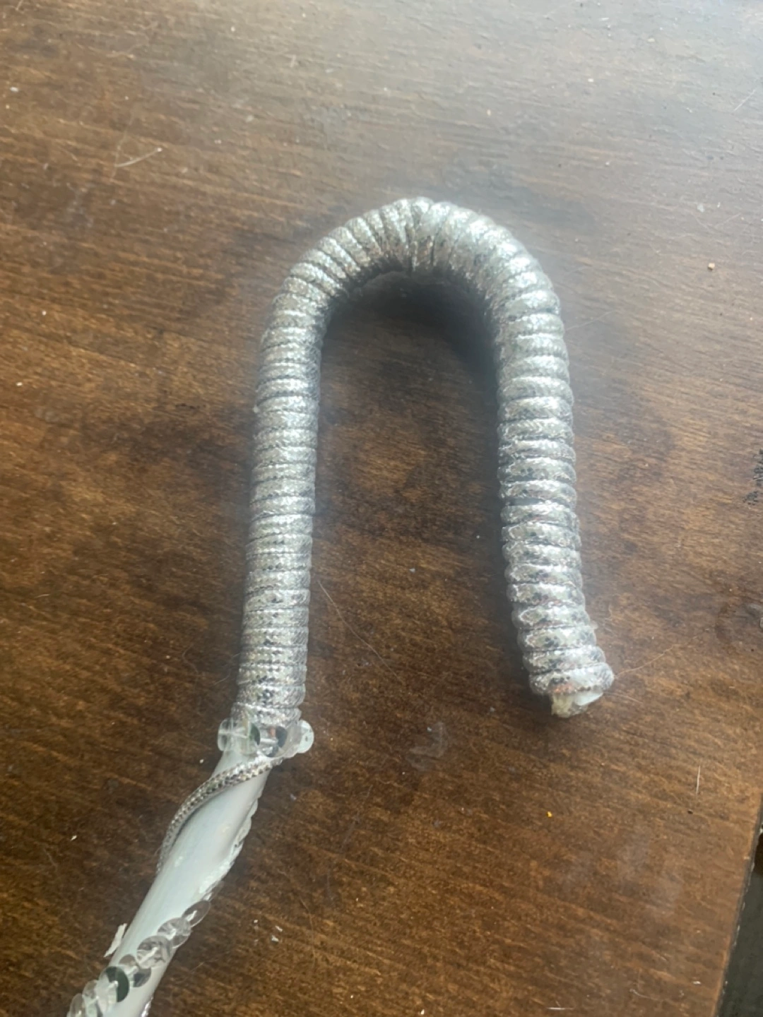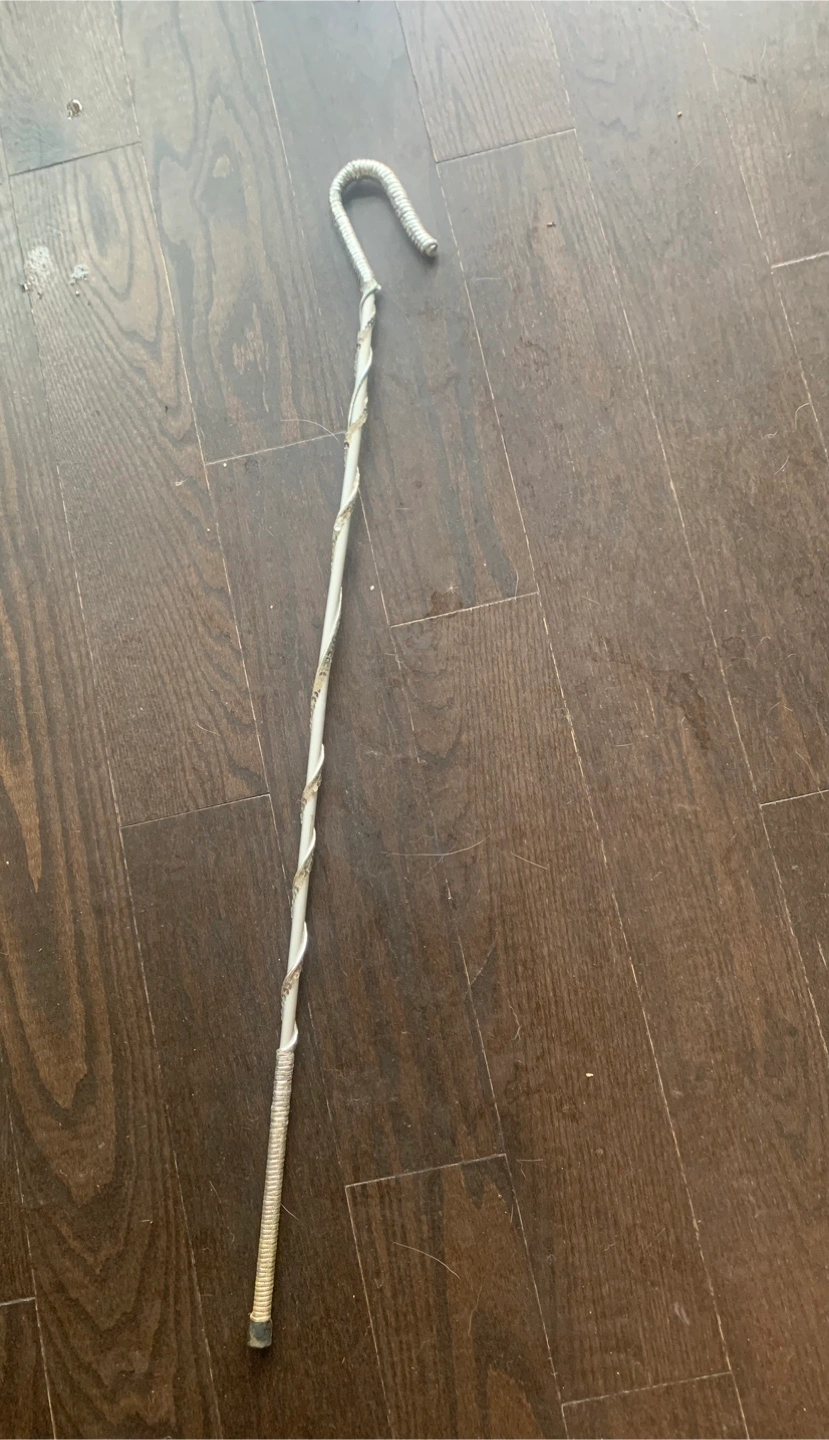 Selling a decorative cane with a silver finish. It has a unique design with a coiled accent along the shaft. The cane measures approximately 36 inches in length. It shows some minor signs of wear and tear. This is used for performance - theatre, jazz, bellydance (Saidi)