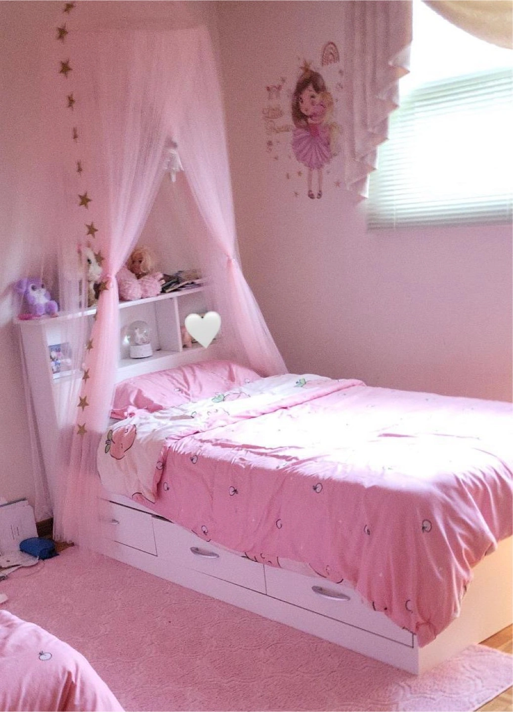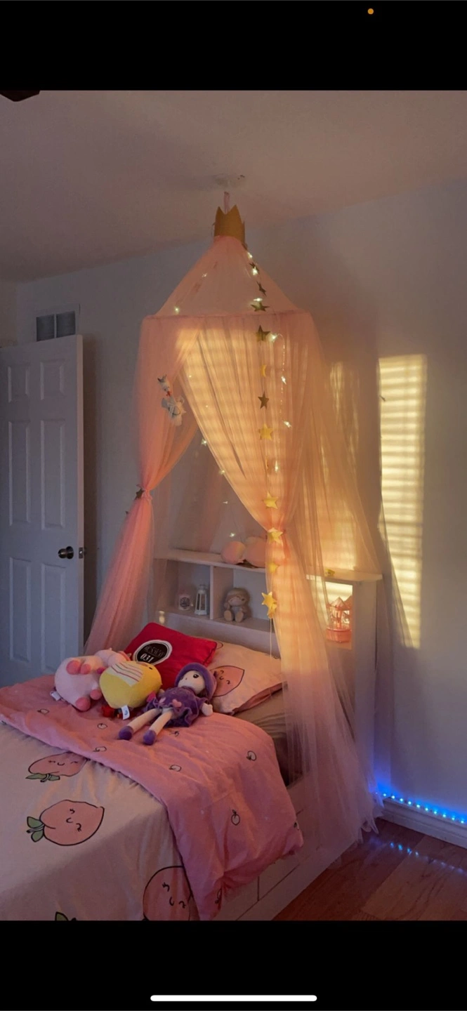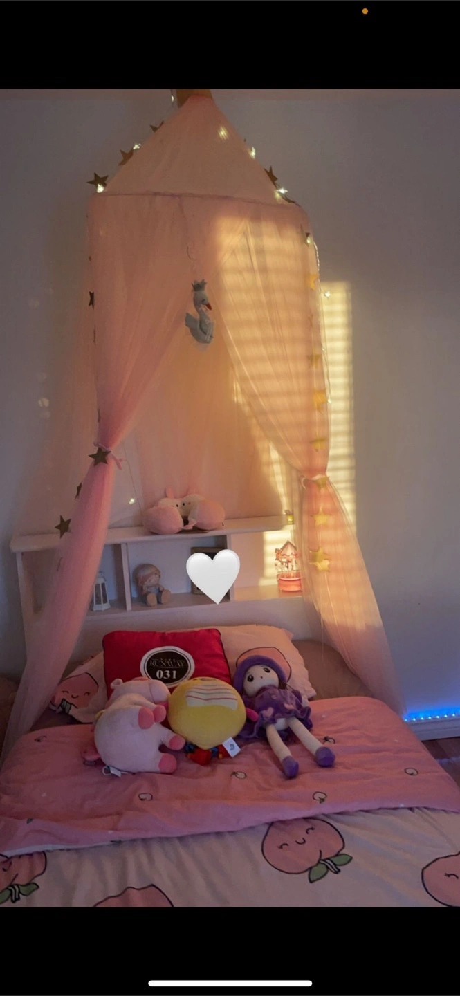 Selling a cute kids' bed with a pink canopy! It's in great condition and would be perfect for a little one's room. The bed frame is white, It also has a built-in bookshelf at the head of the bed.without mattress