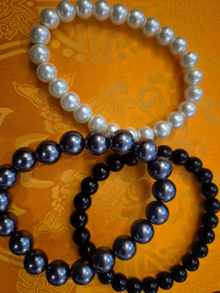 Selling Strethcy Costume jewerly bracelets! They look nice. There is weight to the black bead one, There's one white pearl, one grey pearl, and one black bead bracelet. Perfect for adding a touch of elegance to any outfit set or single 2 dollars
