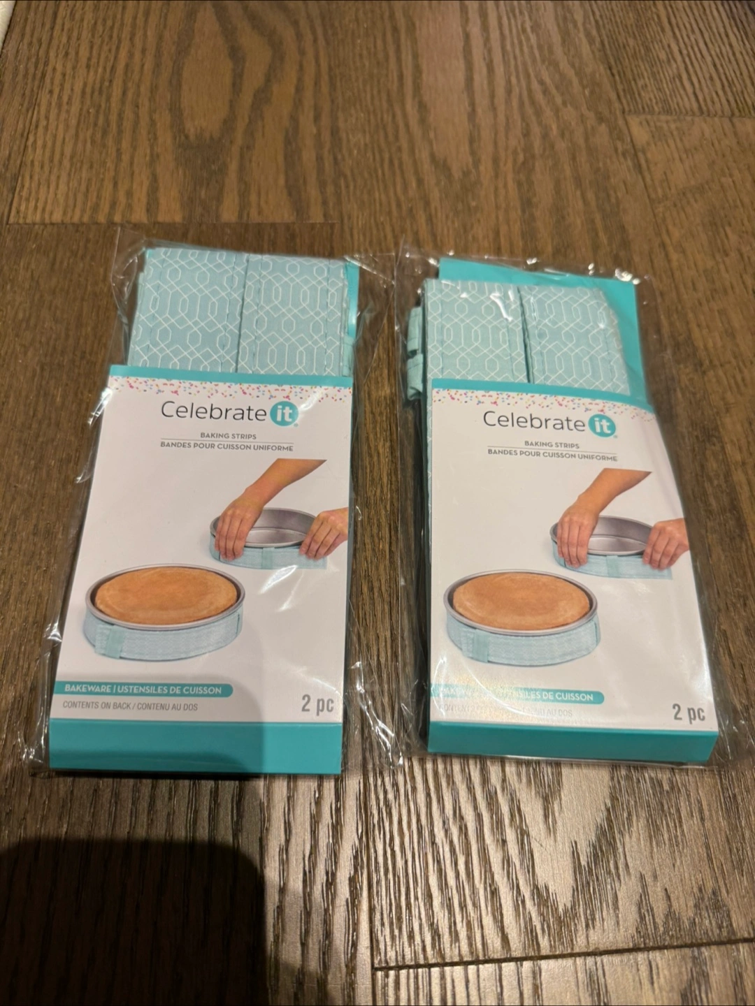 I'm selling a set of Celebrate It baking strips. They are 35 inches long and come in a pack of 2. These strips help ensure your cakes bake evenly. They are brand new in the packaging!