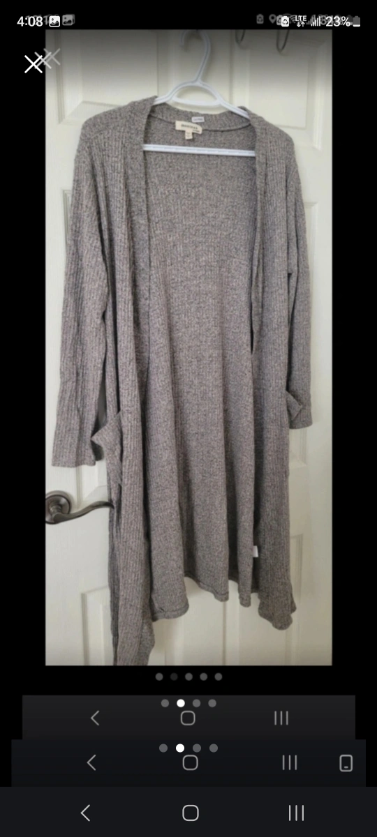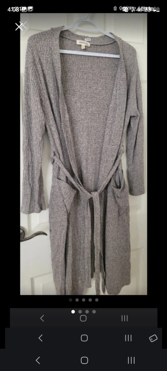 This soft cardigan provides a cozy, relaxed feel perfect for any day. Features a ribbed knit texture, open front, long sleeves, and pockets. It includes a belt for a more elegant look. In Like-new condition Yonge and Finch area