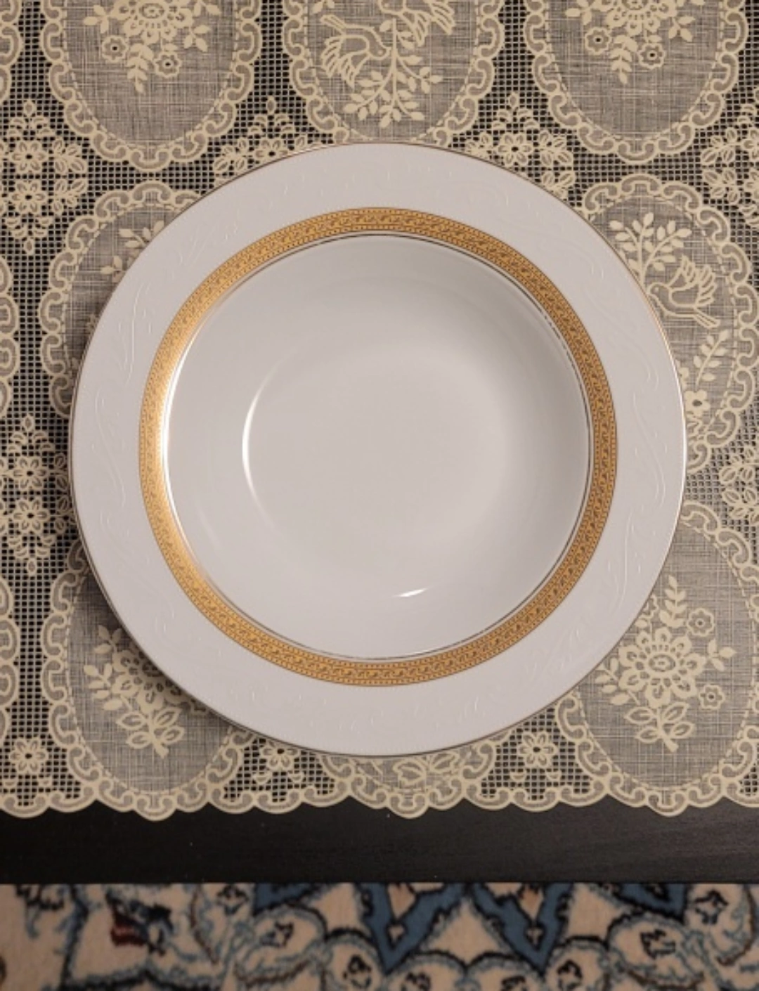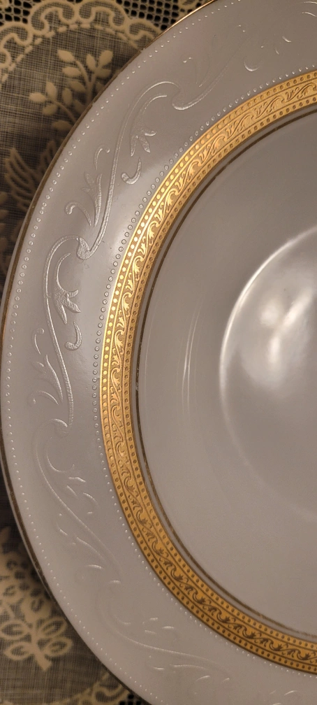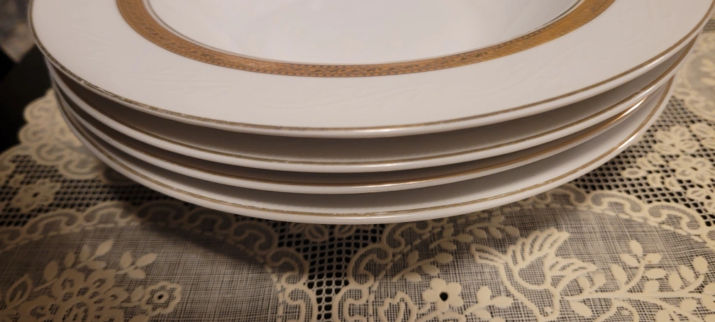 Beautiful, white bowls. Featuring a gold rim and design on the edges. A perfect set for serving soups or salads after a relaxing day. 4 bowls no chips or cracks or crazing Minor utensil marks on one or two bowls bar keeper's friend will get rid of the marks, they are not scratches Yonge and Finch area