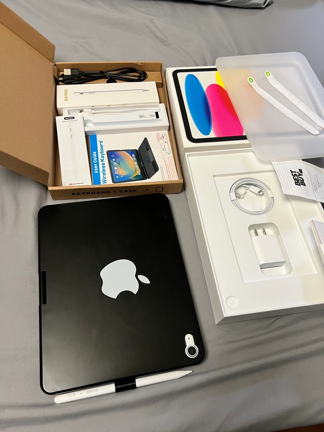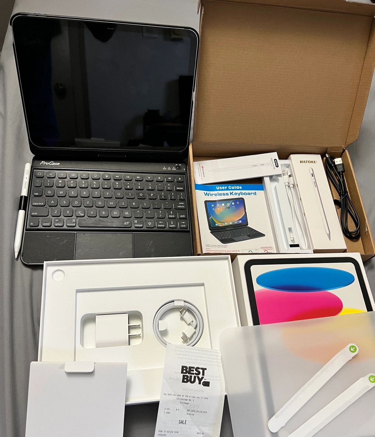Still Brand New looks and Very Good Condition no scratches, no any issues. it’s Barely Used almost stuck in my cabinet.. I haven’t used it much for long time because im busy and to my Gaming PC. as you can see on the pictures are complete box Sticker’s, Cable & Charger are not used and same for those cable of Pencil and Pro Case. Still their box that’s all new. I’m selling this iPad for for those people who are more useful than me. All items in pictures are included & their retail price. Bought in BestBuy 2024sept “WARRANTY END OF SEMTEMBER” 2025 This iPad already have Tempered Glass Protector & Camera Lens Protector. iPad 10th Gen64gb 499.99 + tax almost $600+ Pro Case 59.99 + tax & shipping Pencil 19.99 +tax & shipping Tempered Glass, Lens Protector $15 + tax & shipping. Everything is fine. Not rush I’m looking to trade for only insta360 X5 or X4 just in case. (FIRM PRICE) No low offer pls. this iPad is good and if you don’t like it. just let it be and passed. this is for those interested only. Thanks!