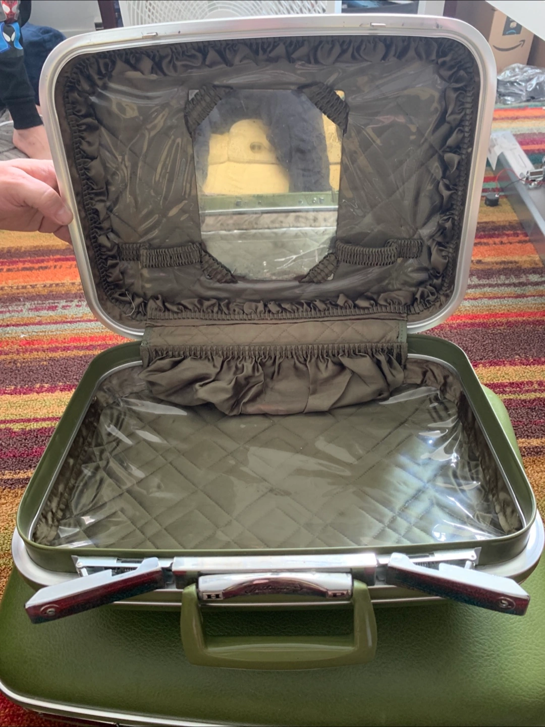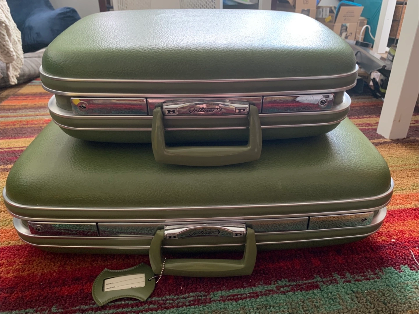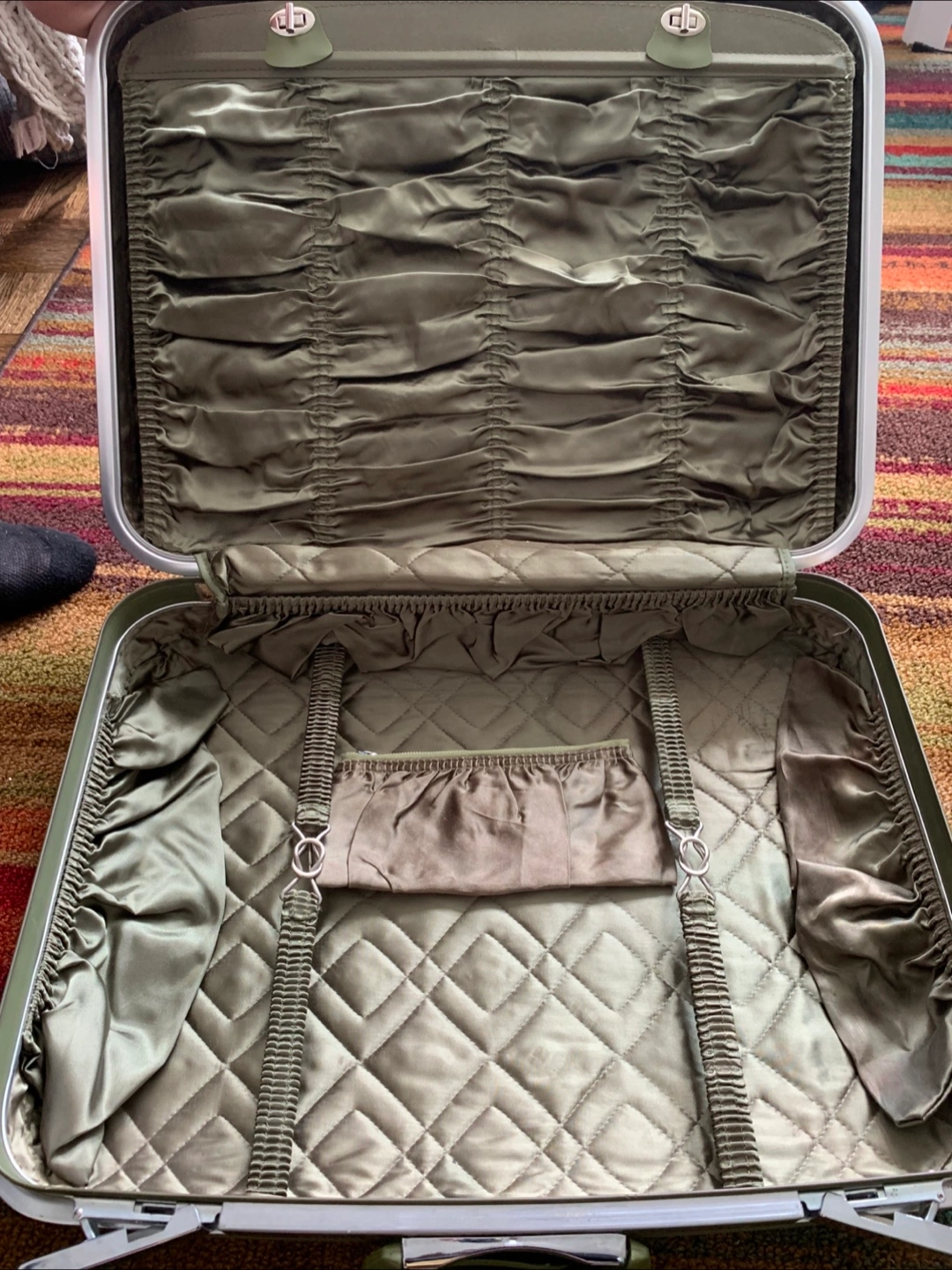 Selling a set of Vettliner by Dominion Luggage suitcases in a lovely olive green color. They have a vintage charm and the interiors are beautifully designed with quilted satin-like fabric. Great for adding a touch of retro style to your travels! 50 OBO