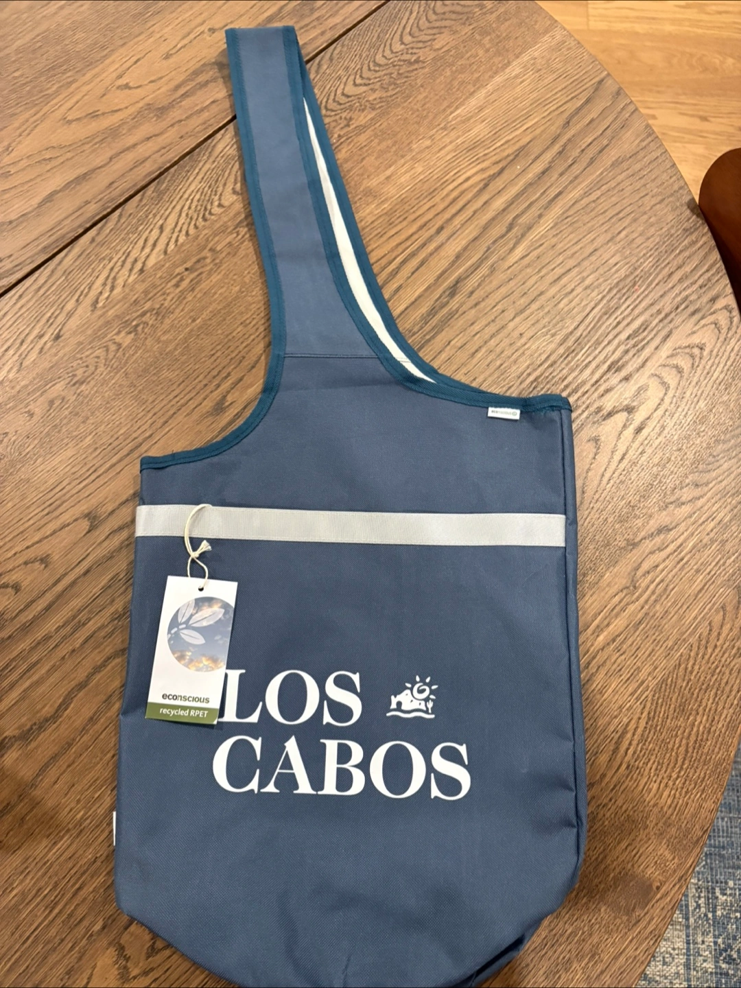 I'm selling a Los Cabos tote bag! It's eco-conscious and made from recycled RPET material. Perfect for carrying yoga mats, groceries or everyday items. New with tag