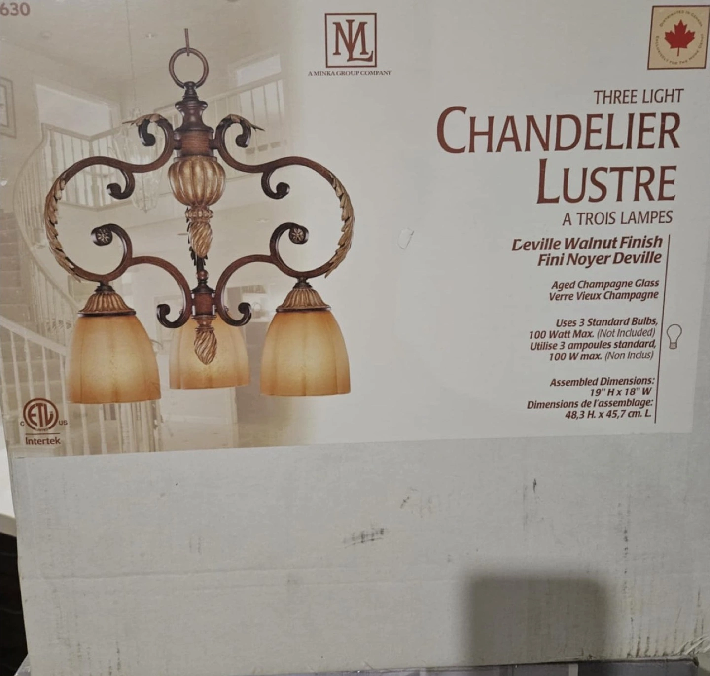 Selling a Minka Group three-light chandelier! It features an aged champagne glass and uses three standard 100W bulbs. The dimensions when assembled are 19" H x 18" W.