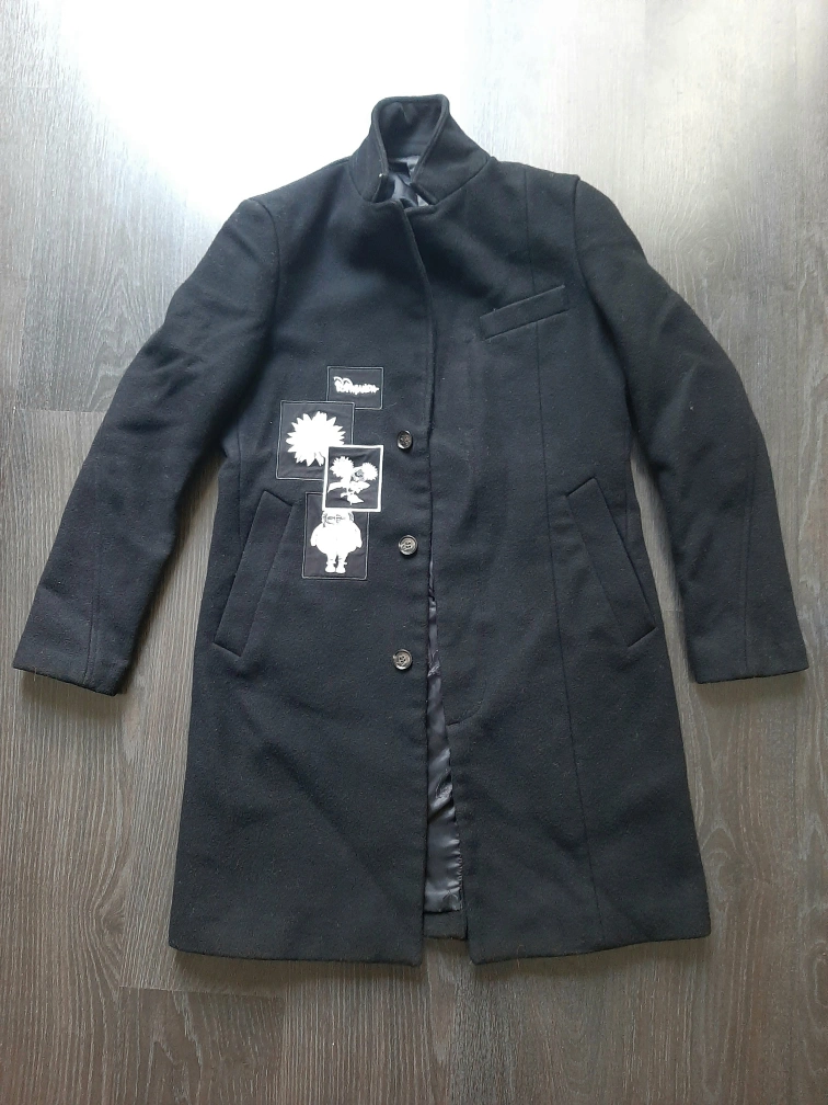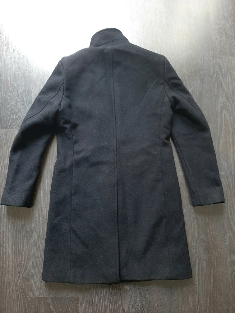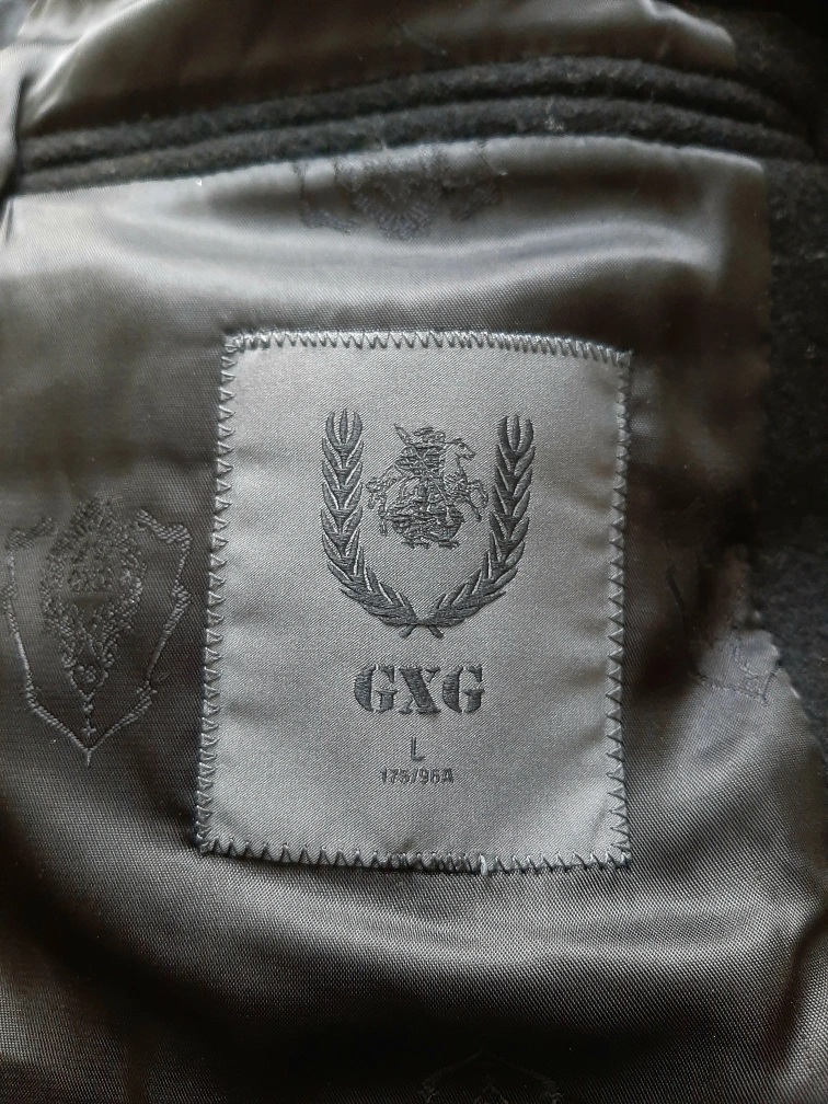 A stylish black wool coat from GXG in size L. It's in great condition and ready to keep you warm this season! The coat features a classic design with a button closure.