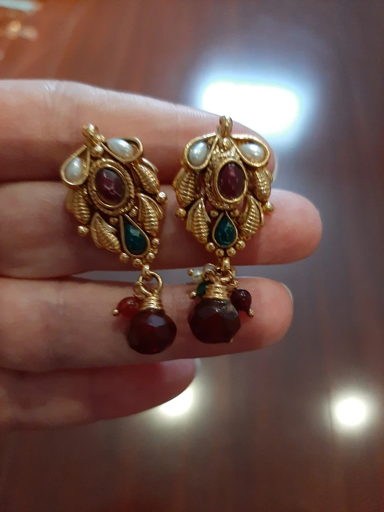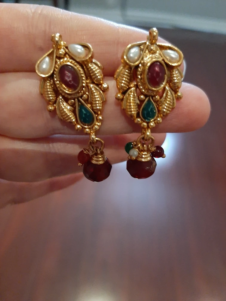 These earrings feature a beautiful gold tone with intricate detailing. They have a dangle design with red and green coloured stones. Perfect for adding a touch of elegance to any outfit! Pick up Scarborough (Sheppard/Nielson)