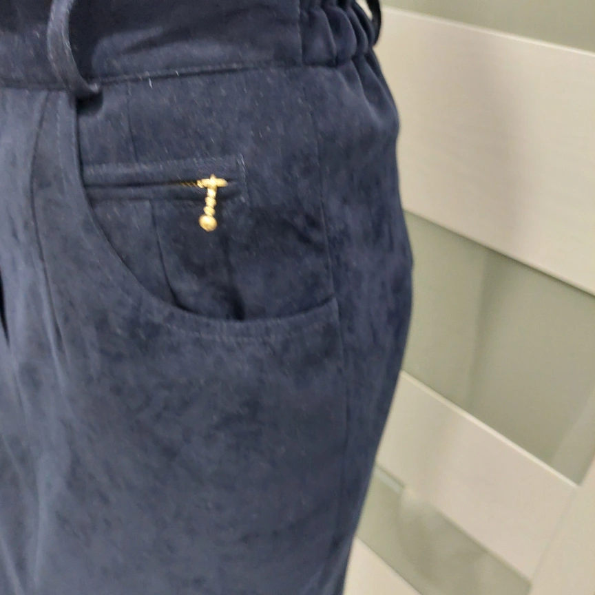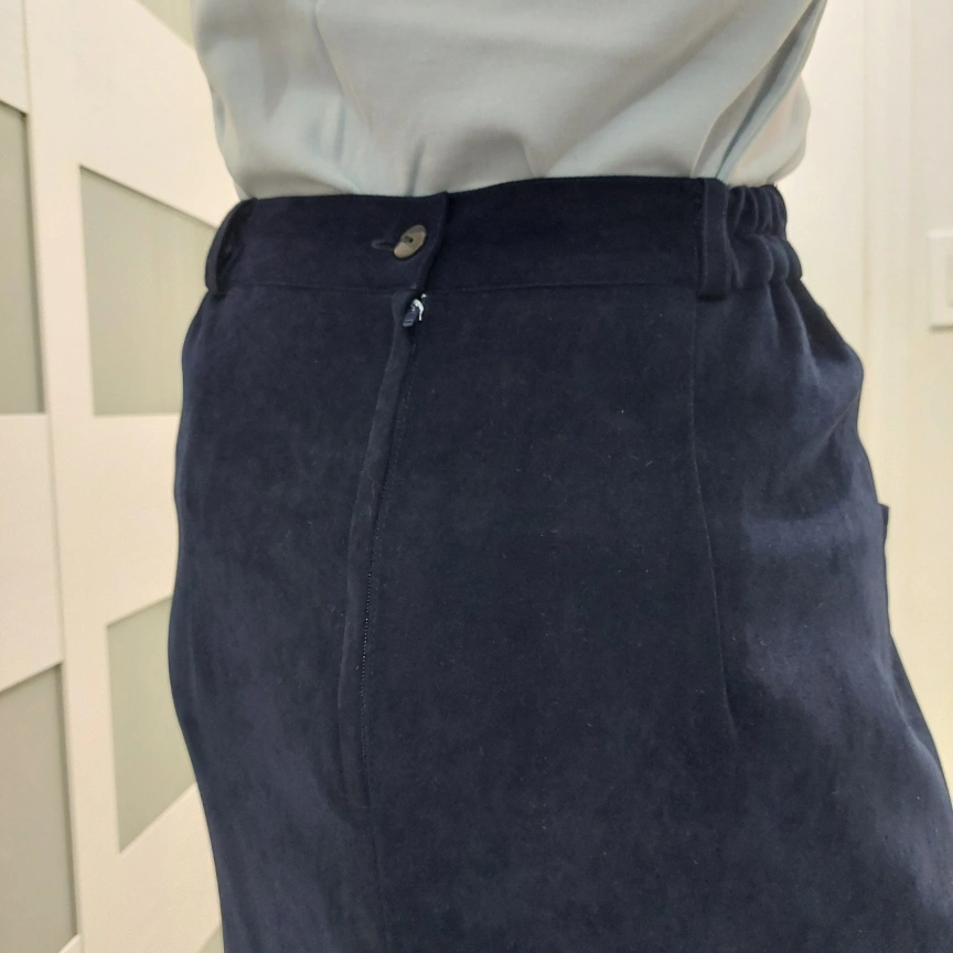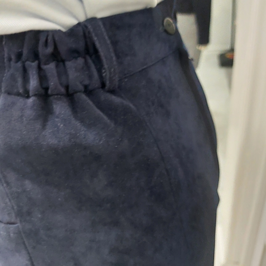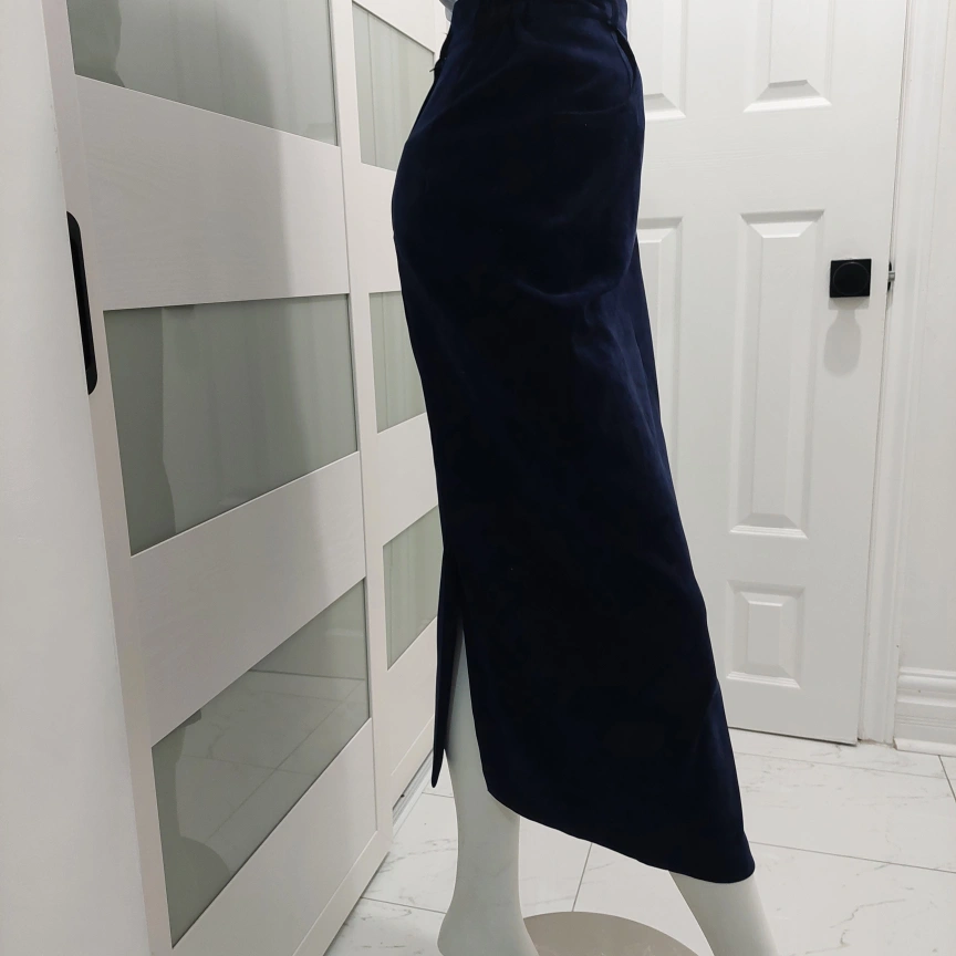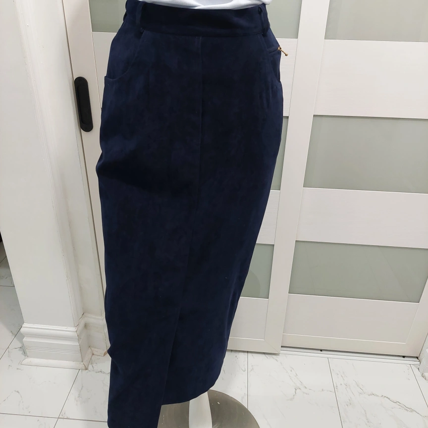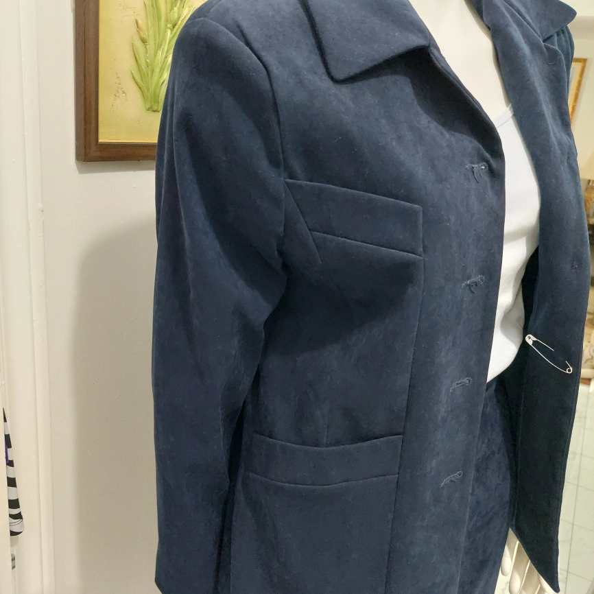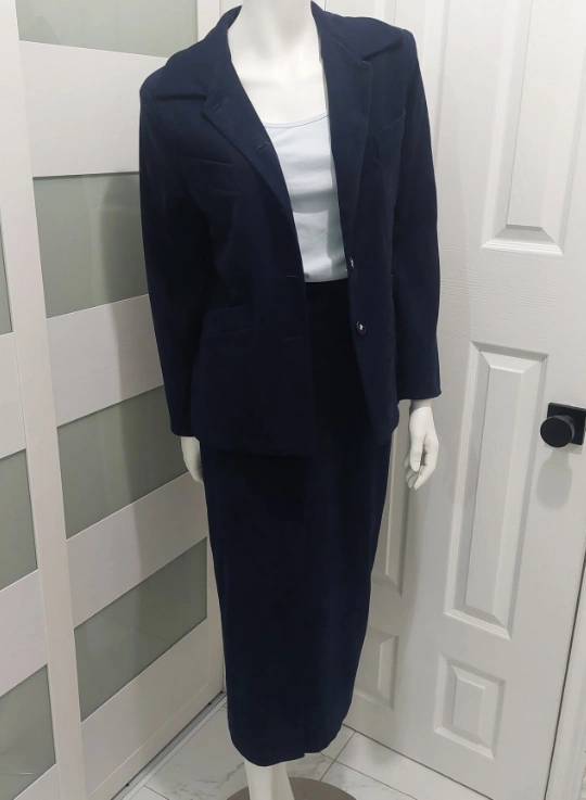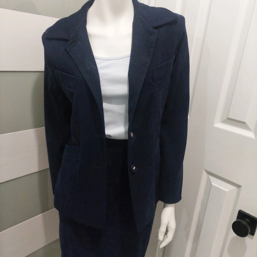 Selling a classic navy blue suede skirt suit. It includes a blazer and a skirt, perfect for a professional look or a stylish outing. The material is soft and comfortable! The skirt and blazer are fully lined.