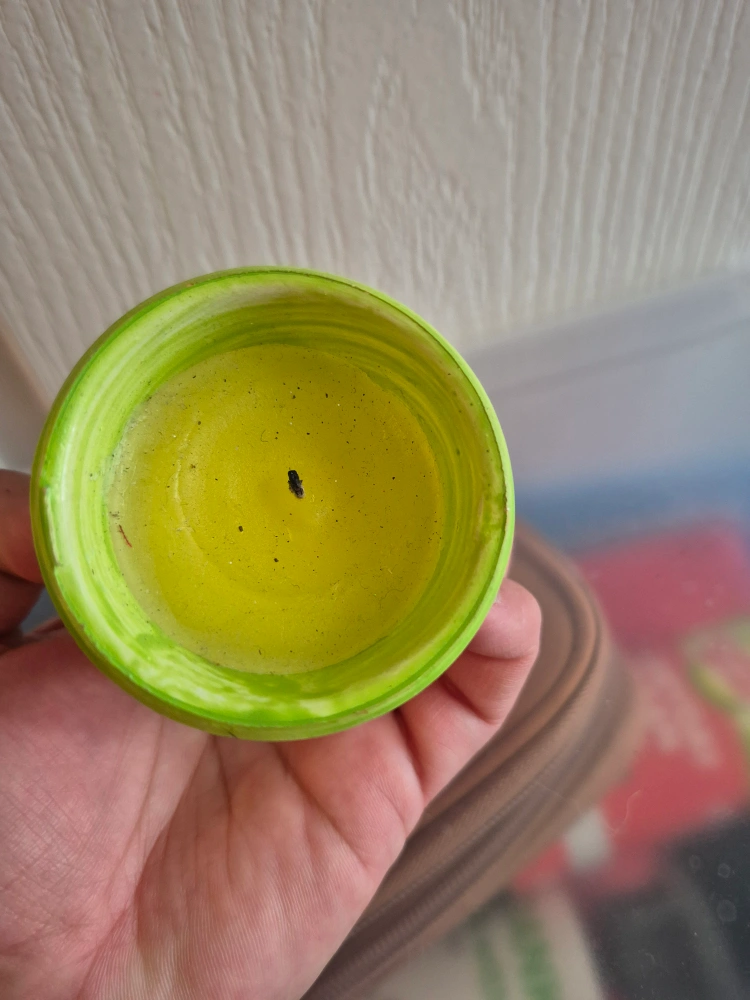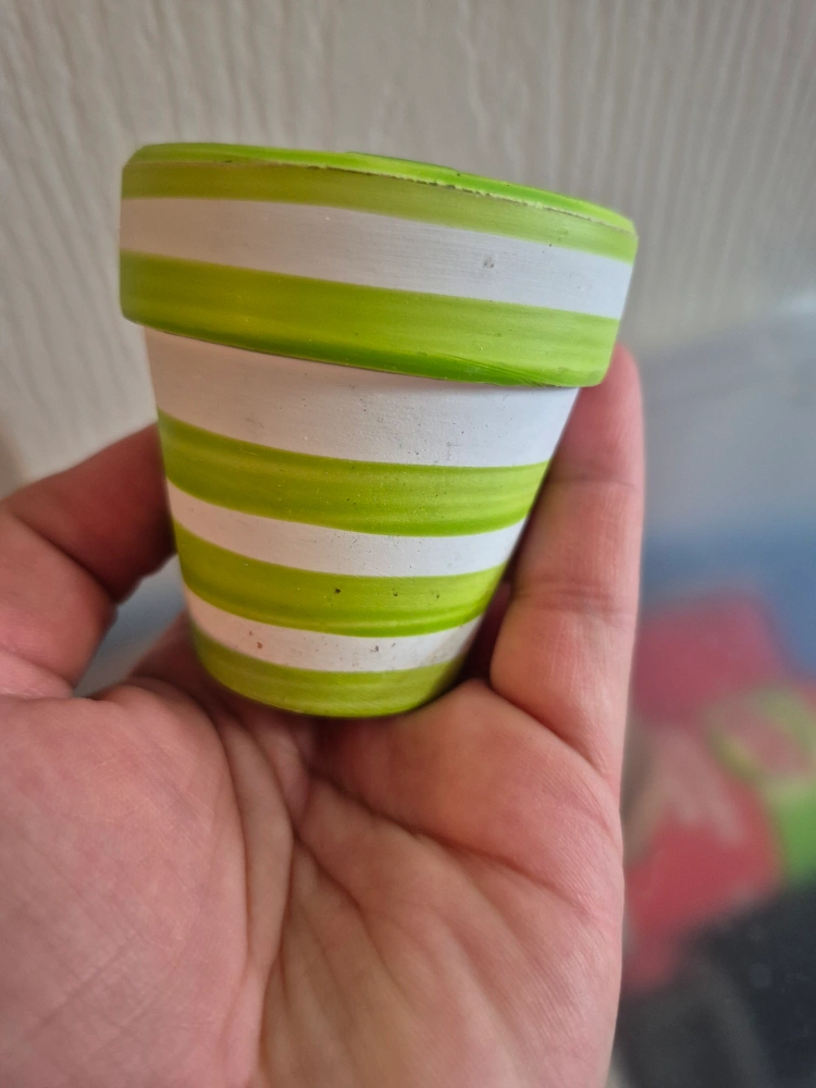 citronella candles outdoor with cute little flower pot clay with green and white stripes. There's a few scuffs on sides( shown in picture) otherwise in good shape