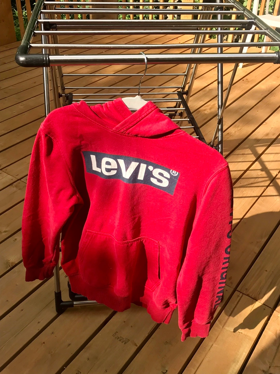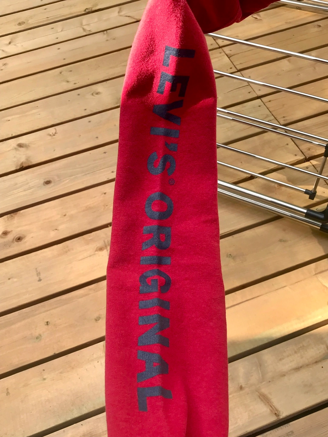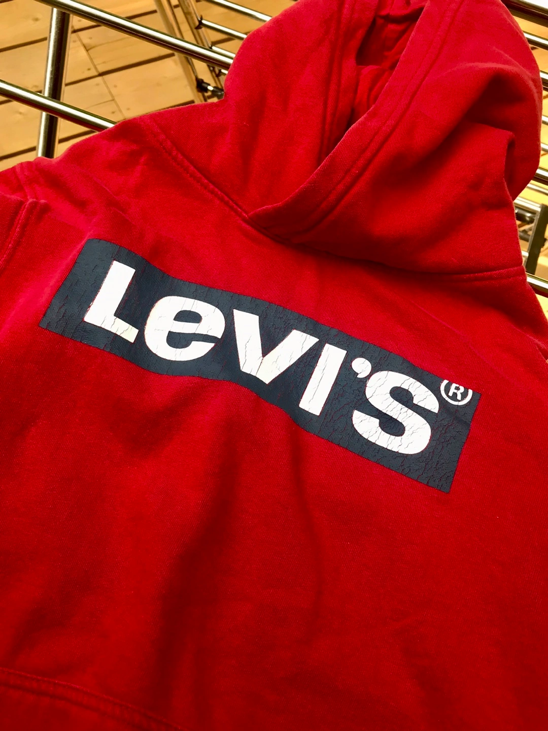 Selling a Levi's hoodie in red! The size is M, which fits kids aged 10-12 years (132-147 cm). It has the Levi's logo on the front and "Levi's Original" printed on the sleeve.
