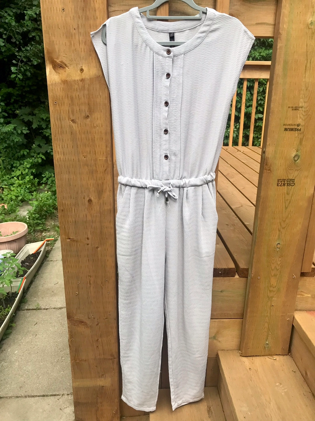A cute light blue jumpsuit! It has a button-up front and a drawstring waist. The material has a textured look to it. It's in great condition and ready for a new home