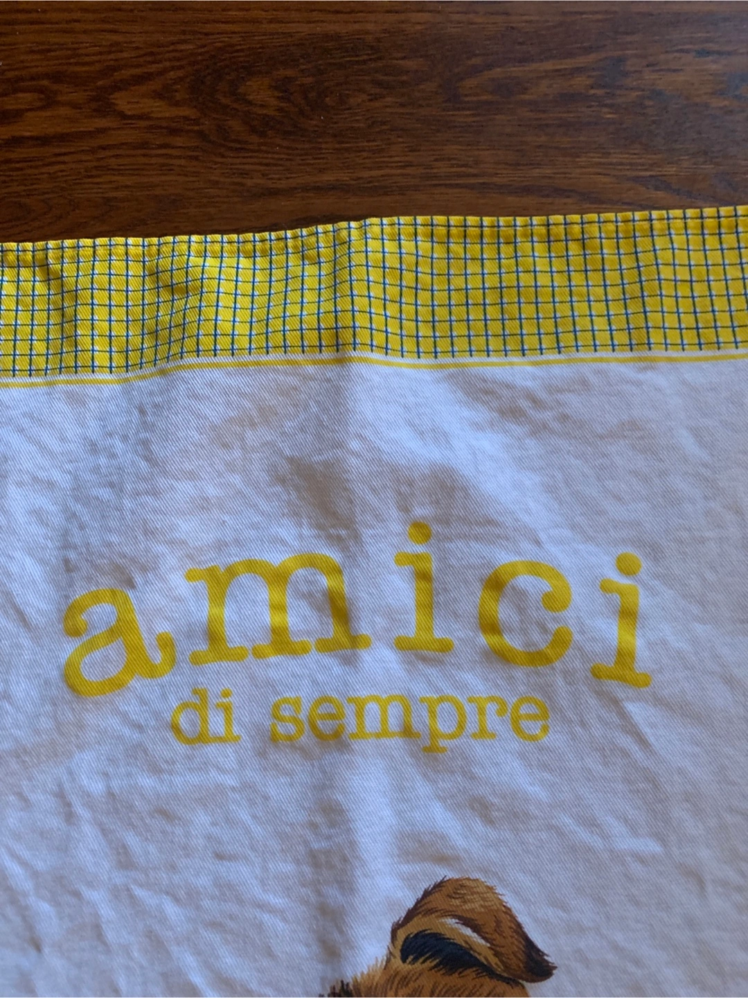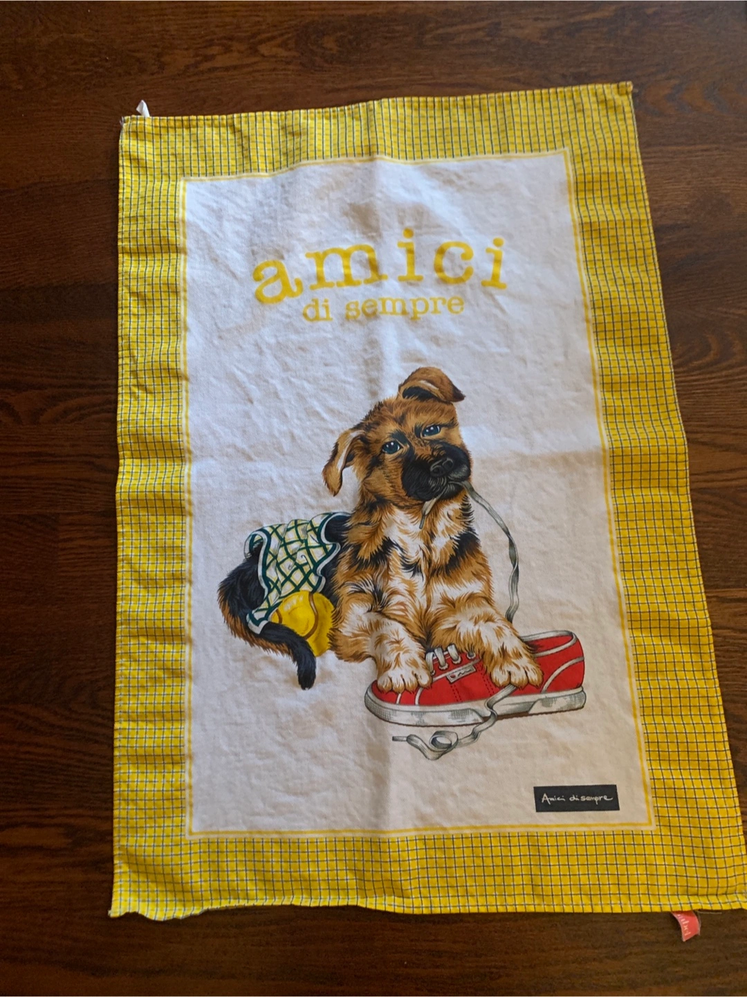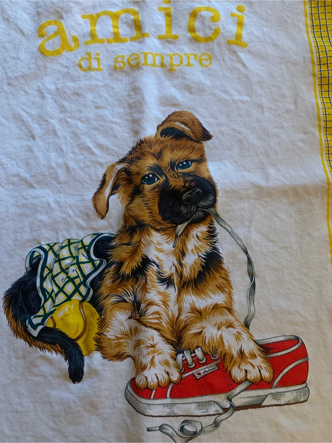 Here's a cute Amici di Sempre (Friends of All Time) dish towel! Definitely a lovely kitchen accessory for dog lovers! It's made of 100% cotton and features a charming puppy design with yellow checkered trim. Features a hook loop in the back for hanging to dry. Made in Italy, and will be a lovely addition to any kitchen! Cash only please.